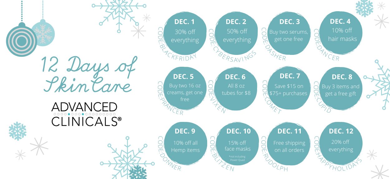 Hope everyone is having a wonderful Thanksgiving weekend filled with lots of delicious food and quality time with friends and family! How many of you did some damage on Black Friday? Well, if you didn’t get a chance to do some holiday shopping, you’re in luck! If you are a skincare junkie, or have someone on your list that is, you will want pay close attention to these amazing Advanced Clinicals deals.