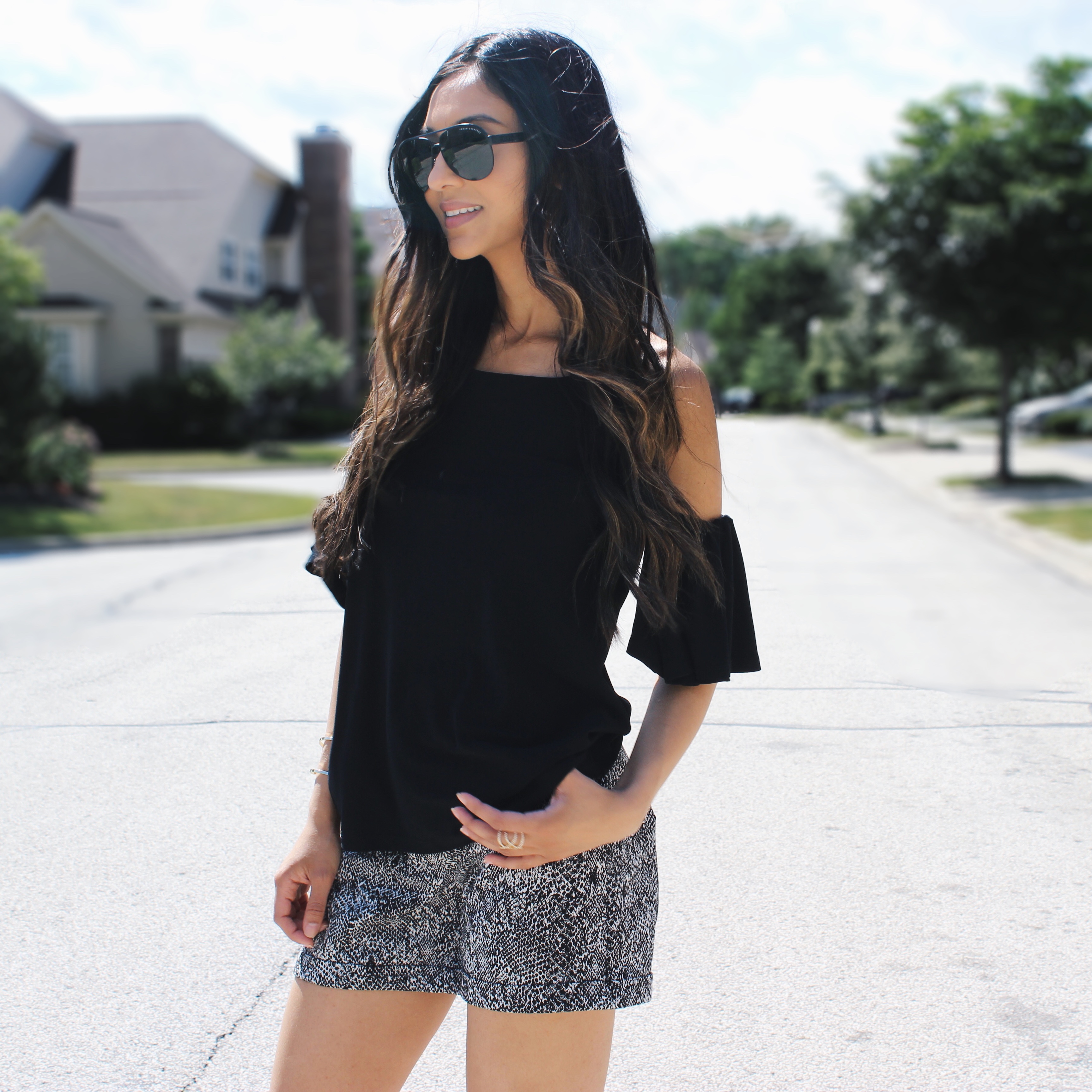 The next look I’m wearing is a solid black cold shoulder top paired with some animal print shorts. How fun, am I right?! The top is a must for everyone. I think if you’re not too much of a fan of the off-the-shoulder trend, the cold shoulder trend is just for you. Cold shoulder gives you just enough shoulder exposure without feeling like you’re showing too much. The printed shorts are available in other colors and prints. The fit is also super comfortable and not too tight.