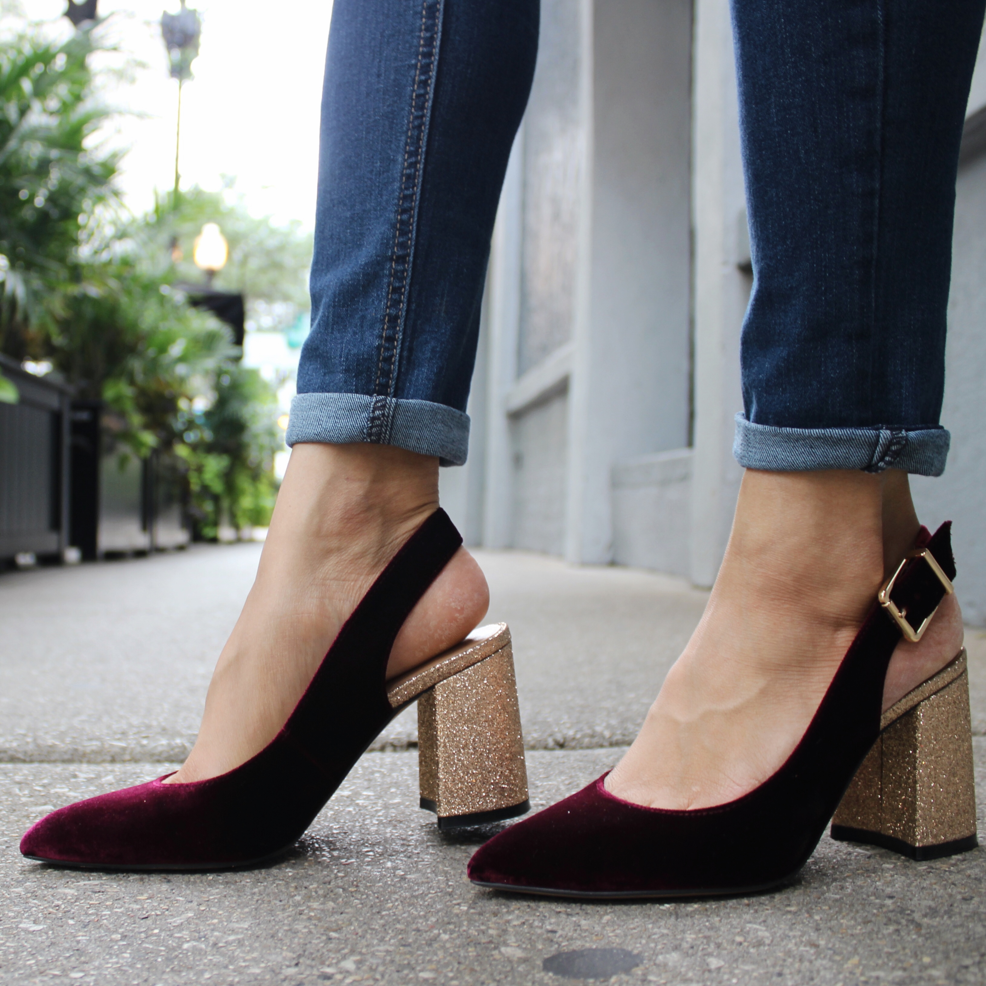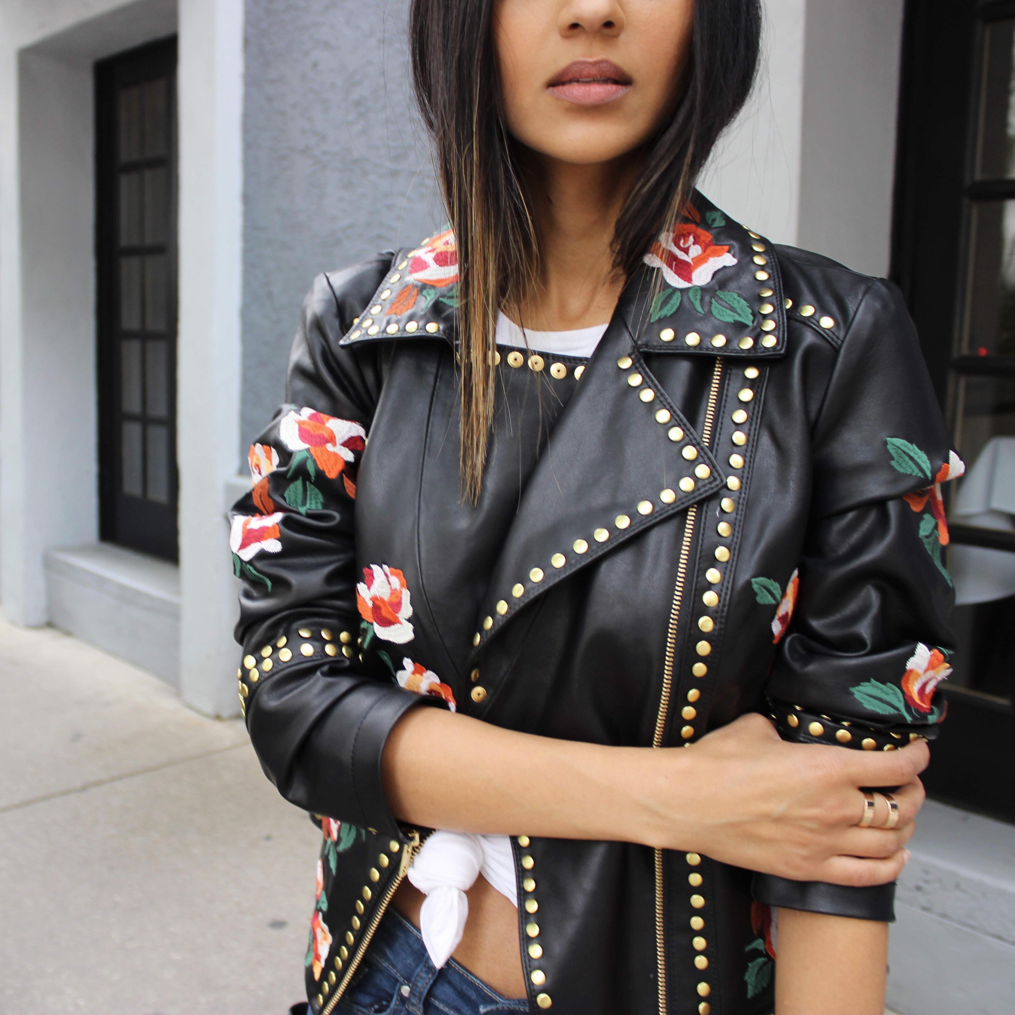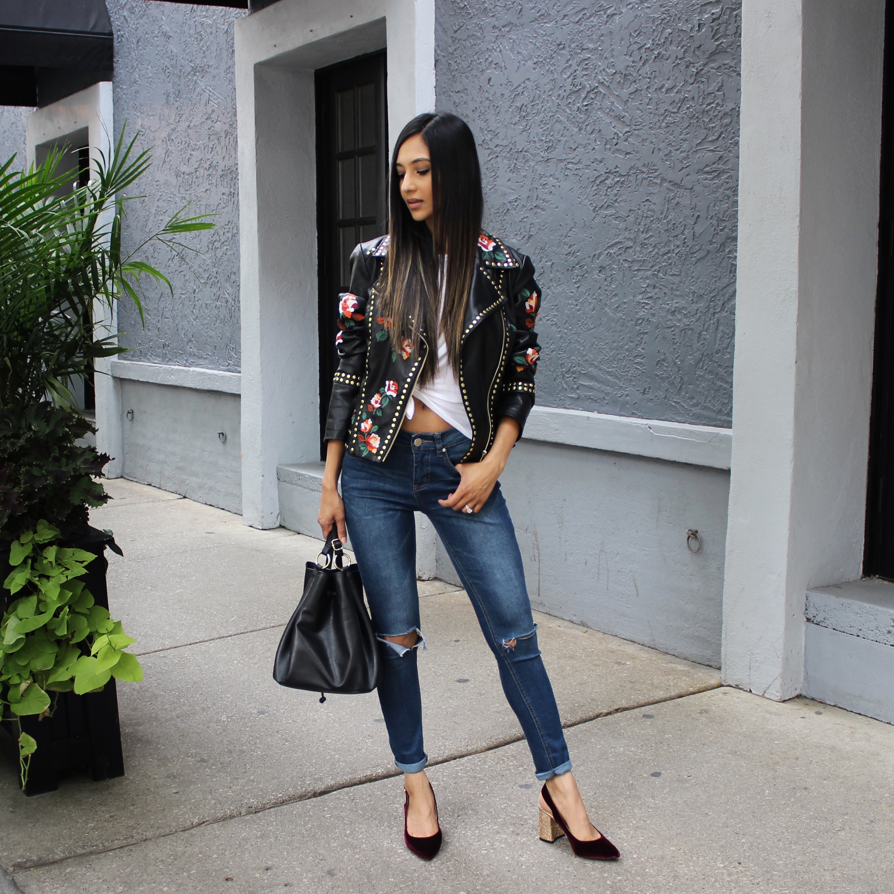 The new collaboration between INC International Concepts and Anna Sui have the best wardrobe staples for this fall pieces for every girls closet. They are edgy and chic, and I would say amazing transitional pieces for summer to fall. She incorporated the floral embroidery craze into some items, like this leather jacket I wore while apartment shopping, turning heads on the streets of Chicago. We all know leather jackets are a fall staple, but why not put a fun spin on it? I’ll be wearing this moto often now that I know how attention-catching it is. I decided to pair it with the cutest pair of maroon velvet slingbacks. Maroon is a popular color for this time of year and the gold heel adds a fun twist to it. I can wear these out at night but also during the day. Plus they have a thick heel, which makes them easy to walk in.