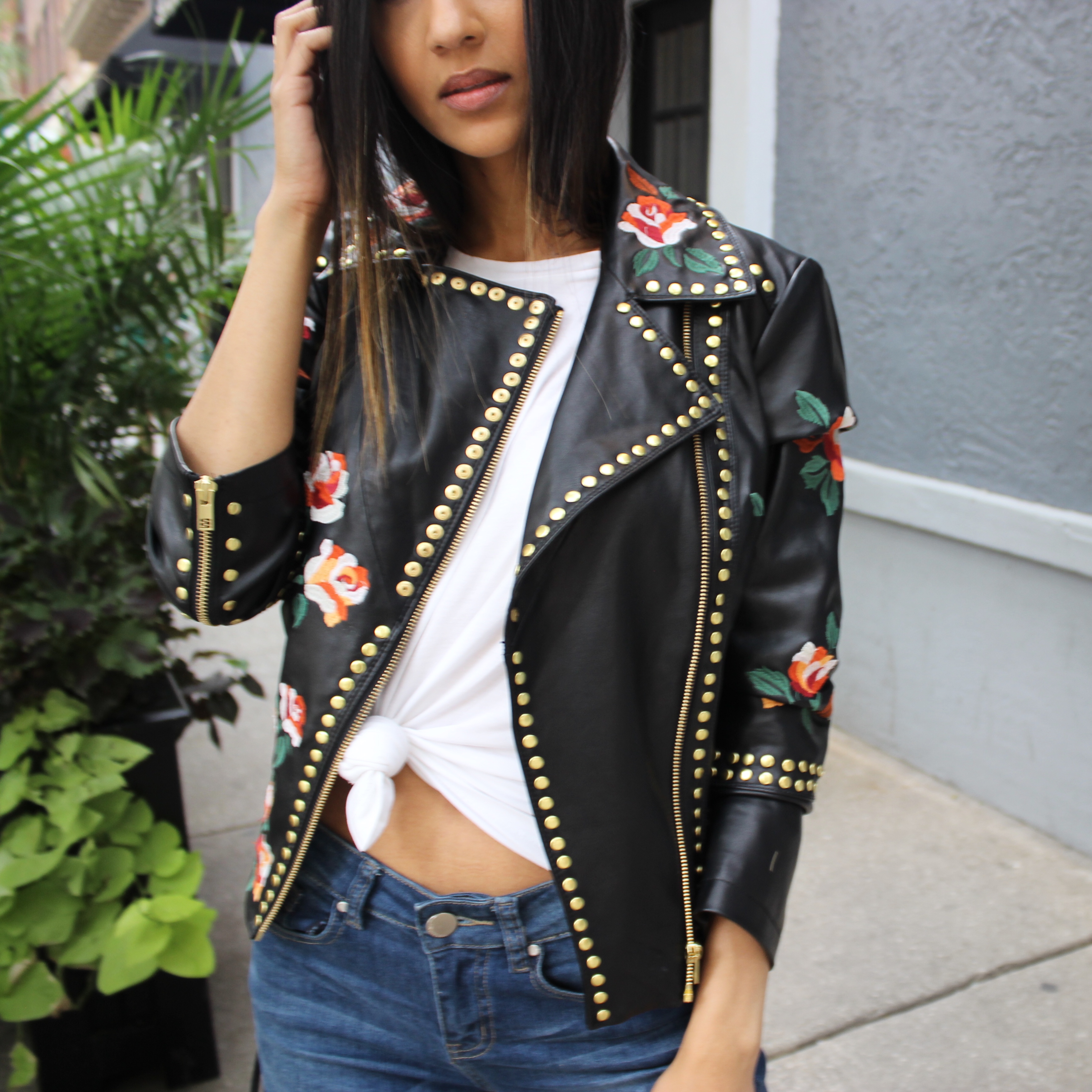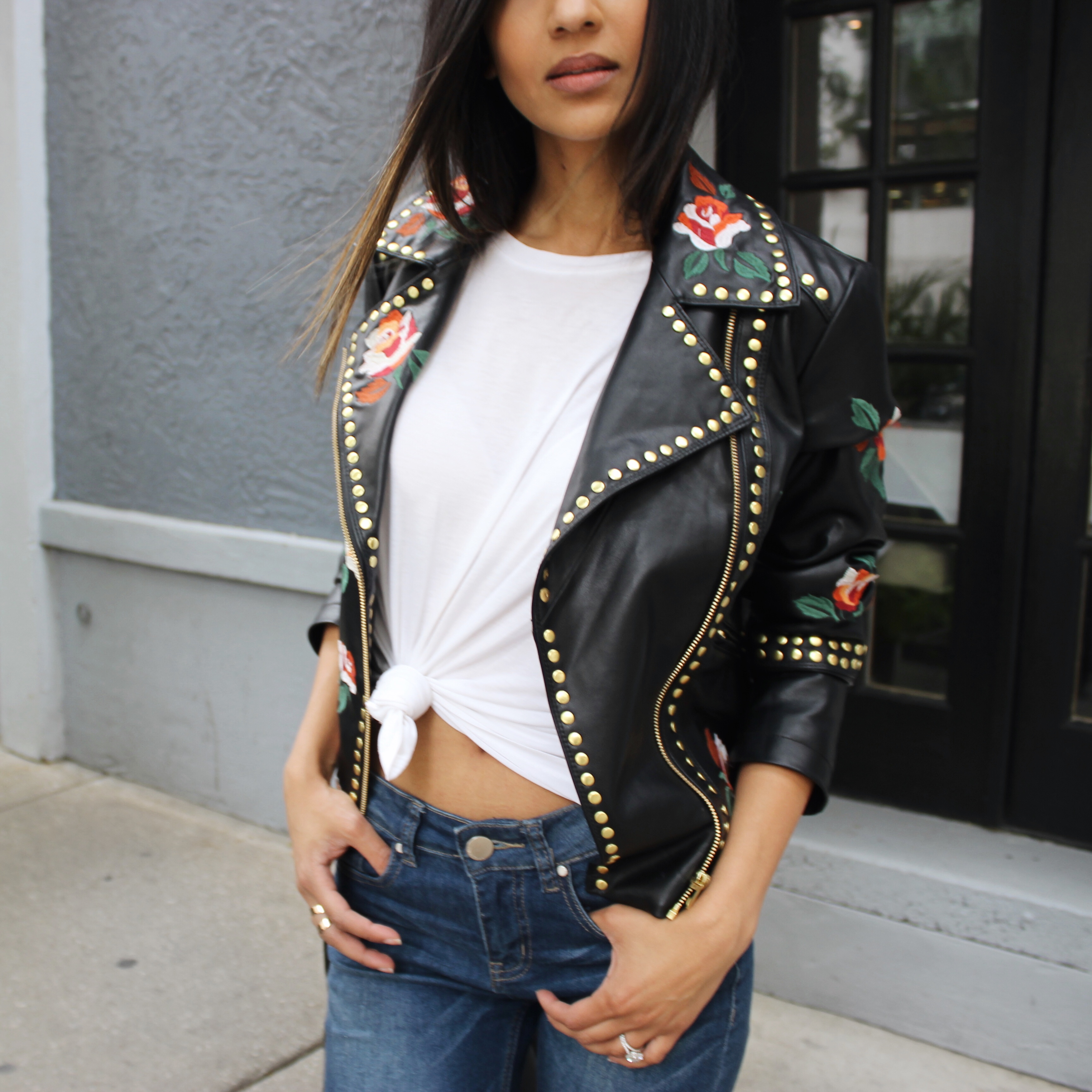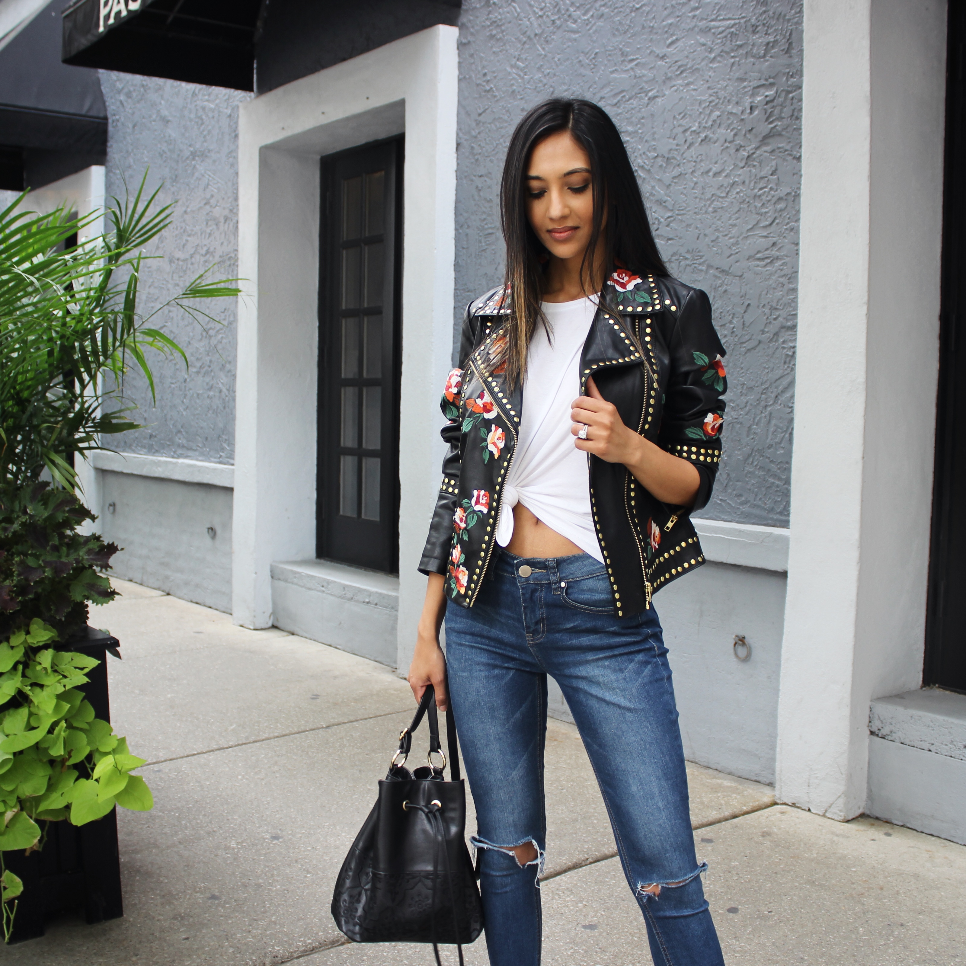 The new collaboration between INC International Concepts and Anna Sui have the best wardrobe staples for this fall pieces for every girls closet. They are edgy and chic, and I would say amazing transitional pieces for summer to fall. She incorporated the floral embroidery craze into some items, like this leather jacket I wore while apartment shopping, turning heads on the streets of Chicago. We all know leather jackets are a fall staple, but why not put a fun spin on it? I’ll be wearing this moto often now that I know how attention-catching it is. I decided to pair it with the cutest pair of maroon velvet slingbacks. Maroon is a popular color for this time of year and the gold heel adds a fun twist to it. I can wear these out at night but also during the day. Plus they have a thick heel, which makes them easy to walk in.