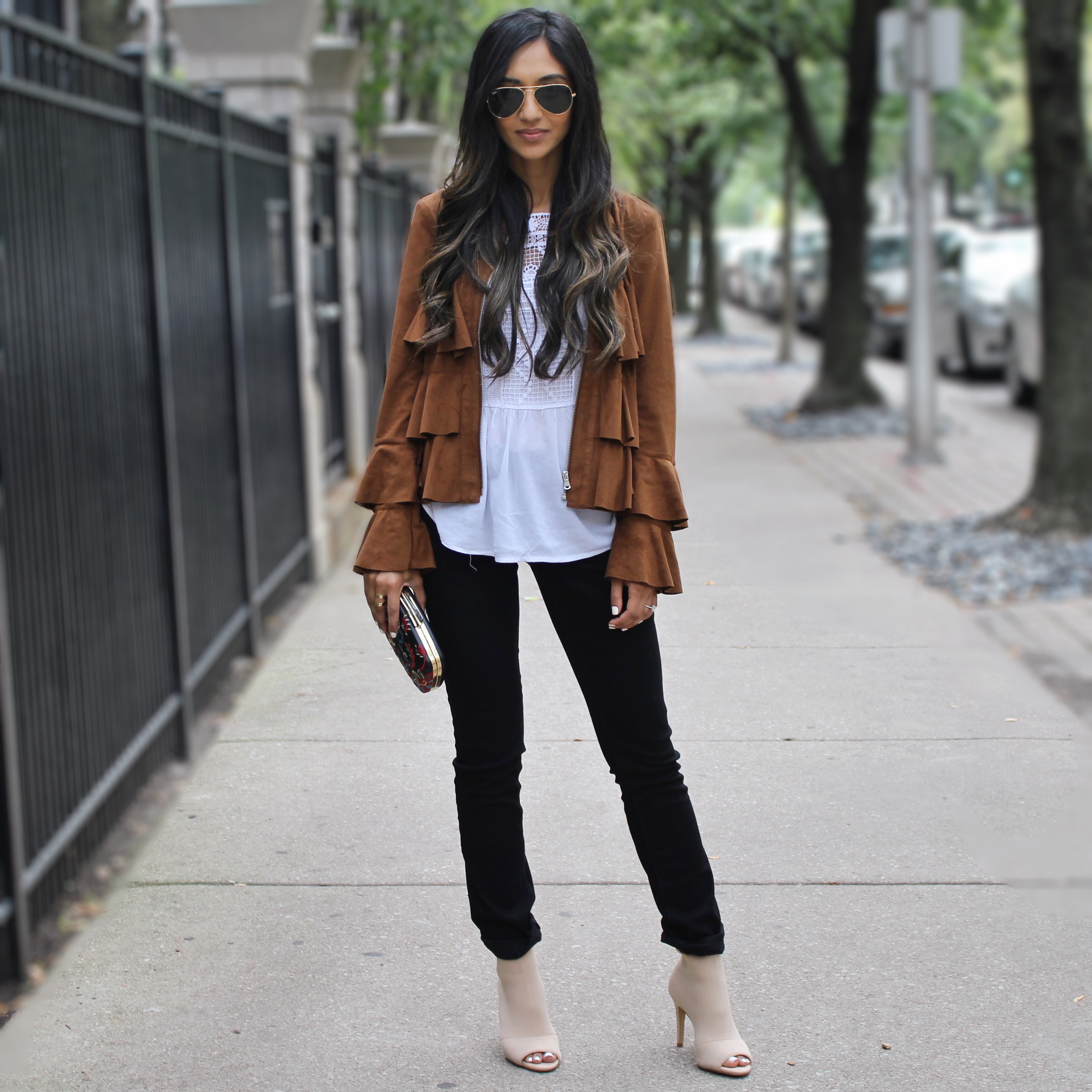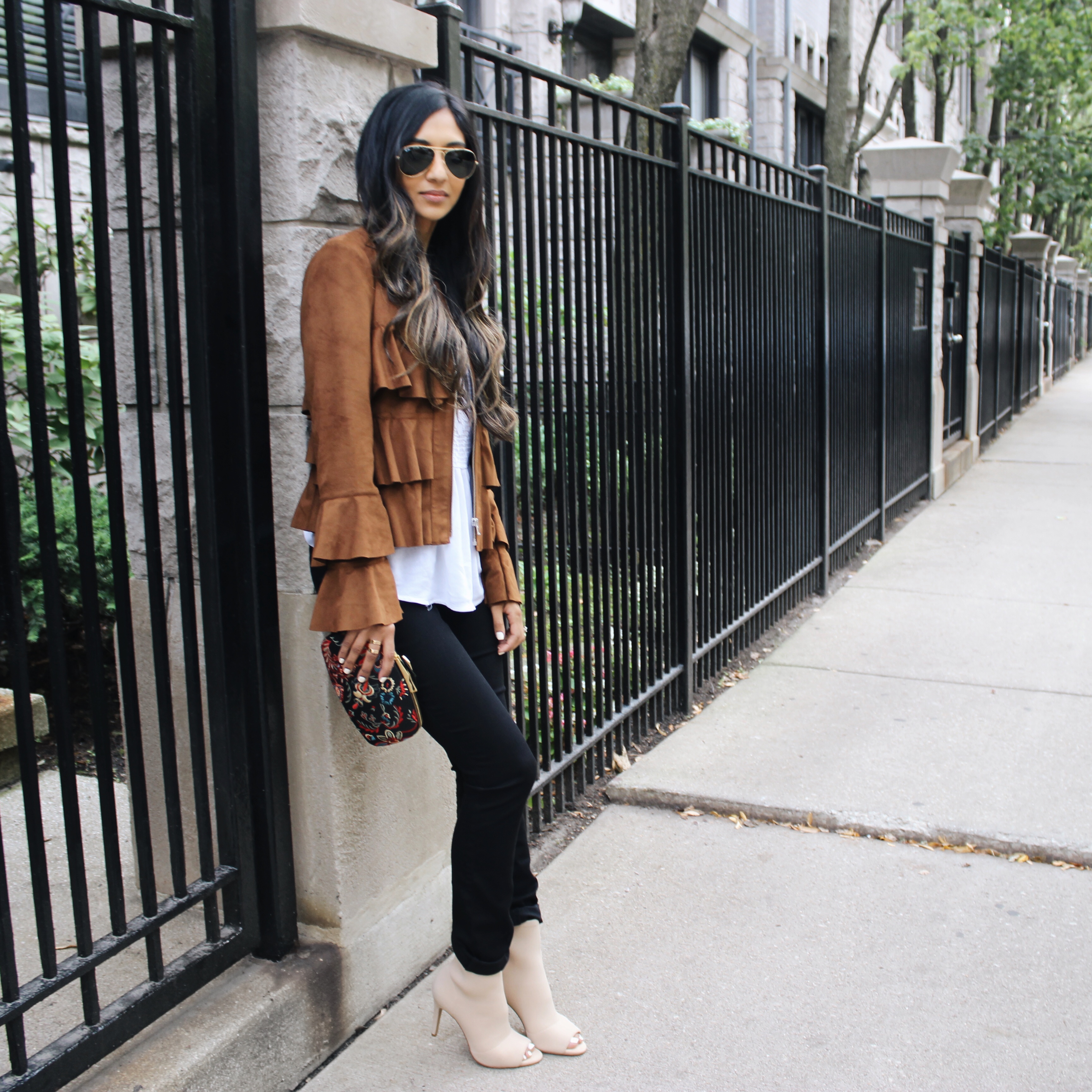 The other outfit I’m sporting above is a layered bohemian styled suede jacket, that is INSANELY soft. It’s so comfy, I didn’t want to take it off. I paired it with some classic black jeans from the same collection, which everybody should have a pair of. However, this jacket could be worn with a mini skirt, like this one from Anna Sui x INC and some over the knee boots for a more nighttime feel. OTK boots are favorite style of shoes for Fall, because they can be worn SOOO many different ways. These beige booties were a great addition to my shoe closet as well and I like the neutral color making them easy to pair. This fun clutch has a chain that can also serve as a crossbody. I love that it’s so loud because is really pops and brightens up this look. So now that I’ve shared my favs for this coming fall. What are some of your favorite fall trends?