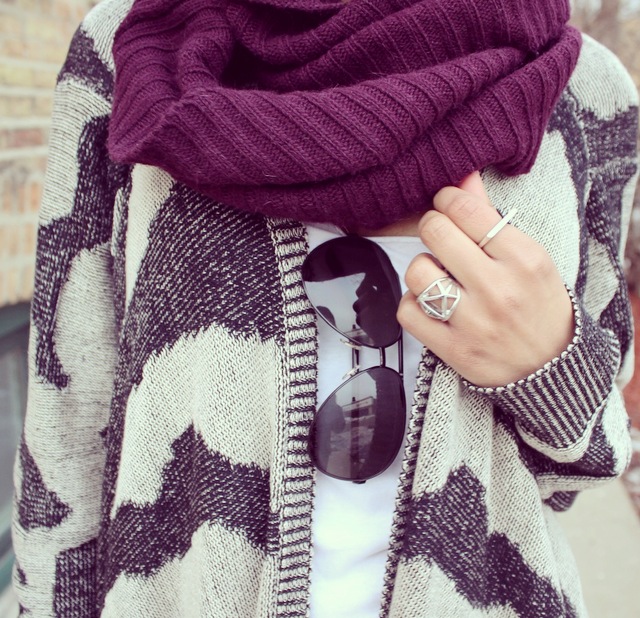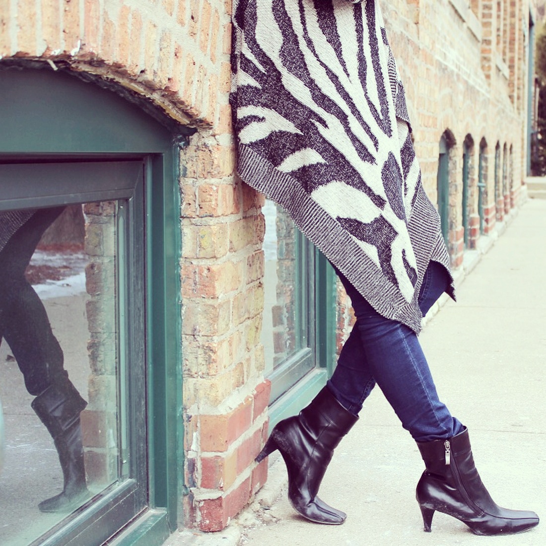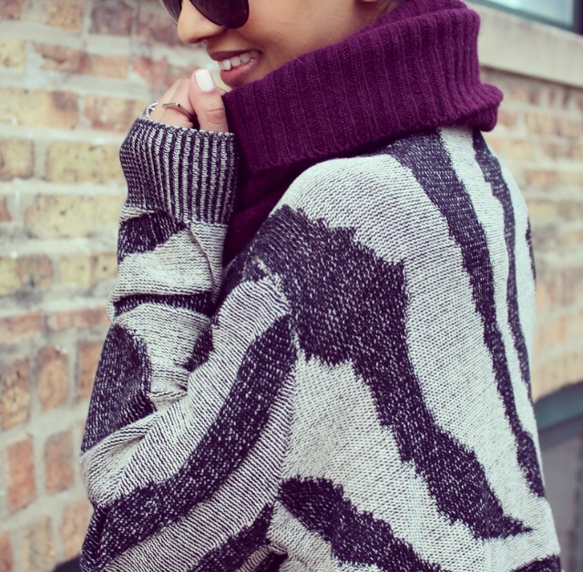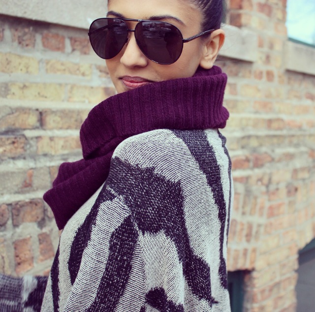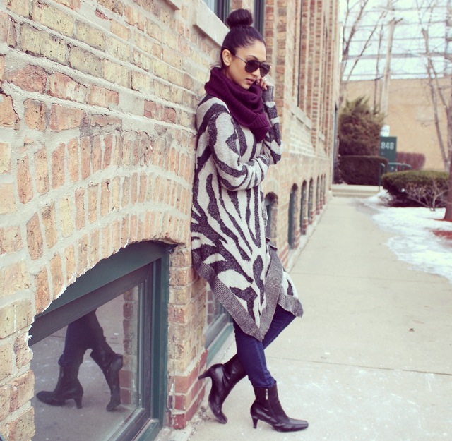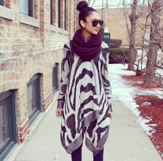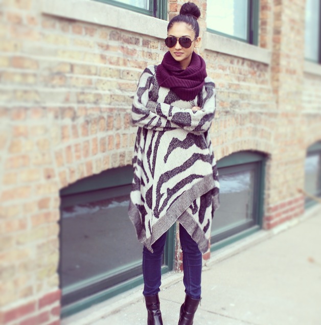 In today’s post I’m wearing a warm and cozy cape sweater from Envy Evanston! The cape-like design gives it a warm blanket feel and the print makes it ultra-chic. I paired the sweater with some dark denim from Forever21 and some Target booties for this never ending winter in Chicago. For this shoot I decided to put my hair up in a sock bun, and by using a hairstyling ring from H&M it really helps keep it neat and easy!