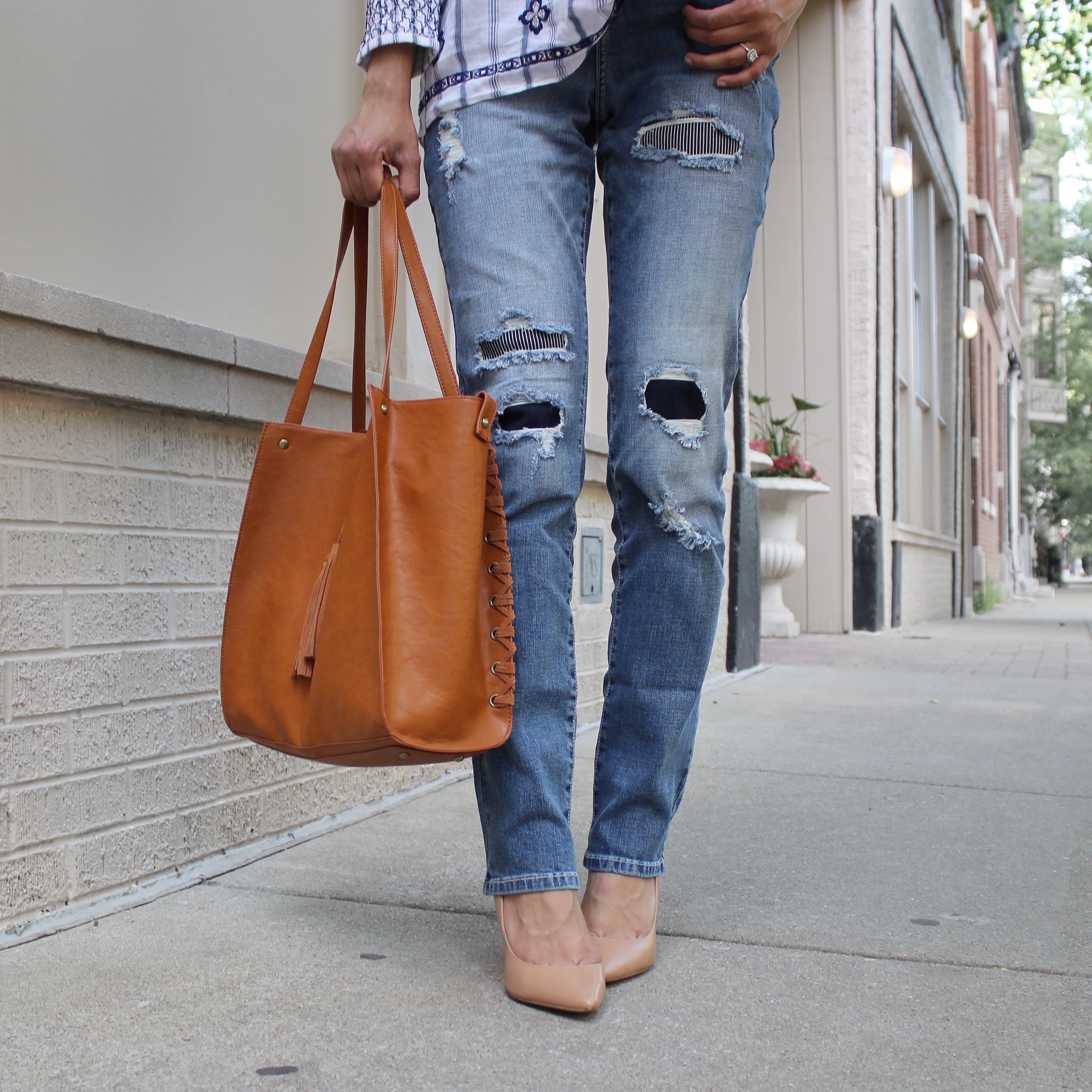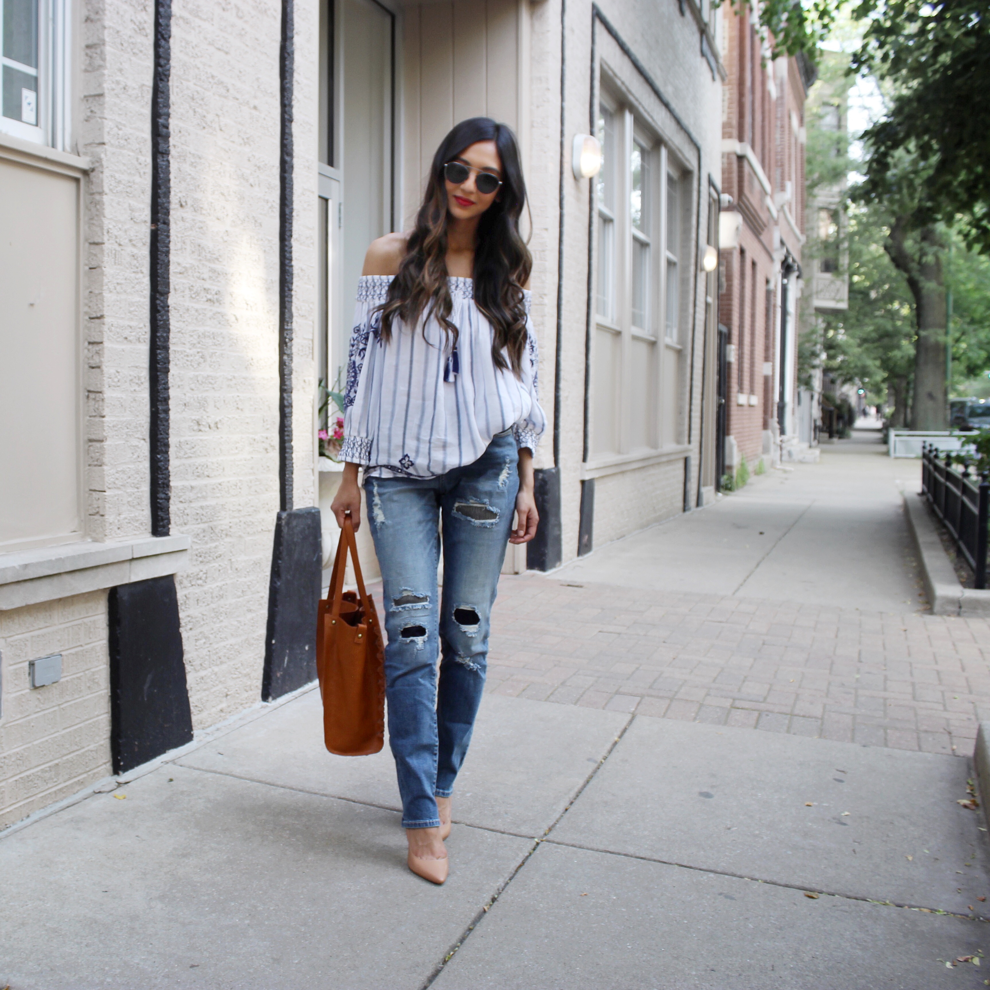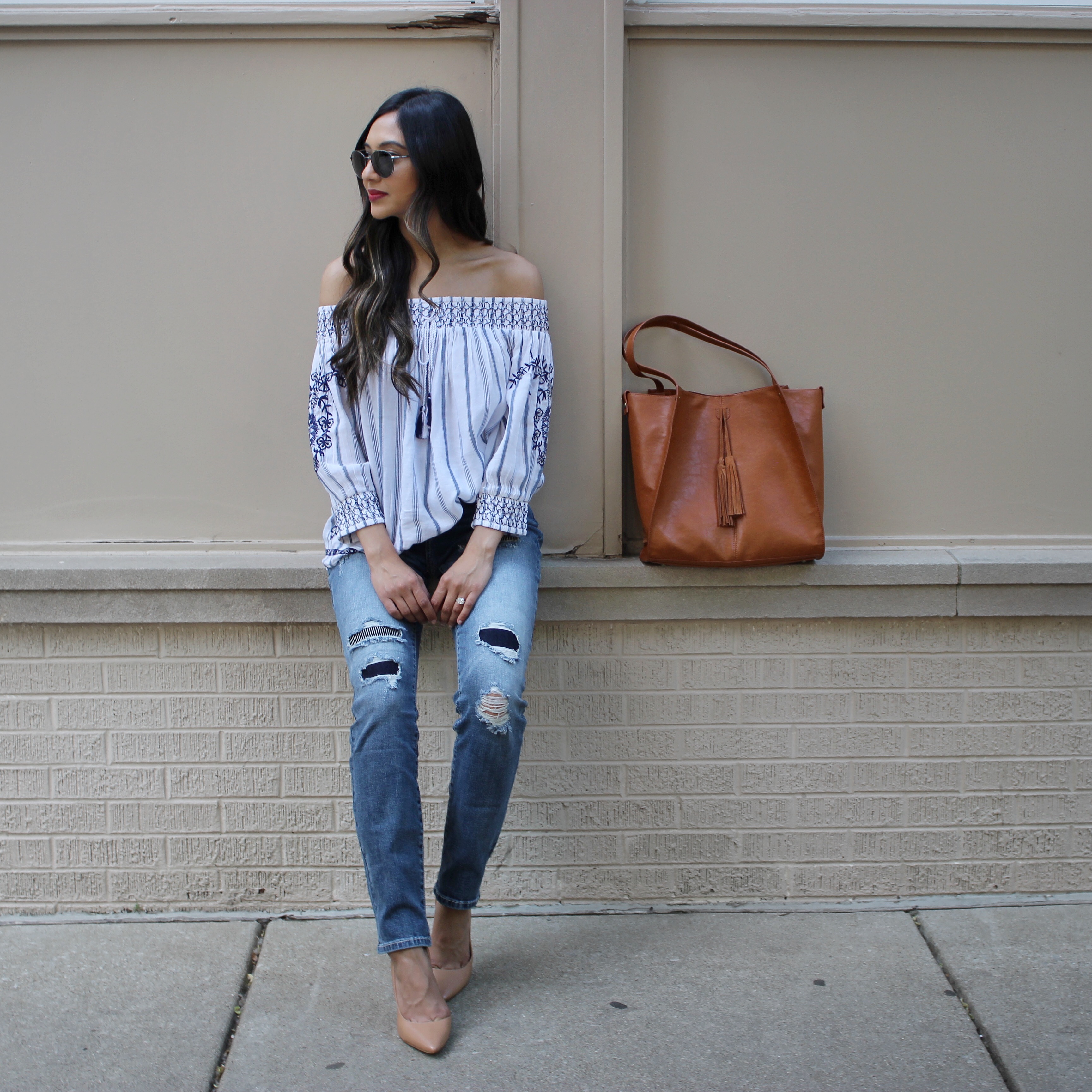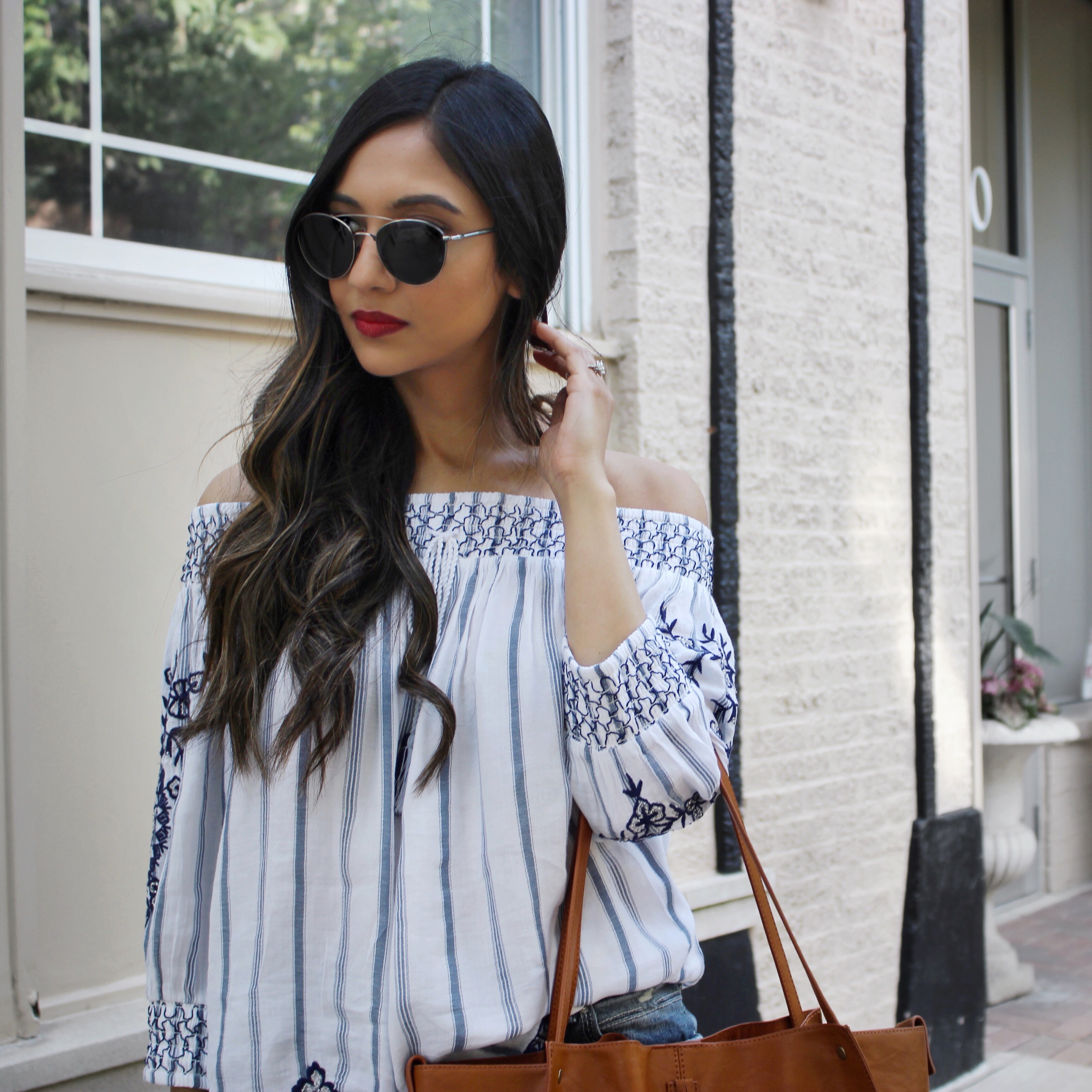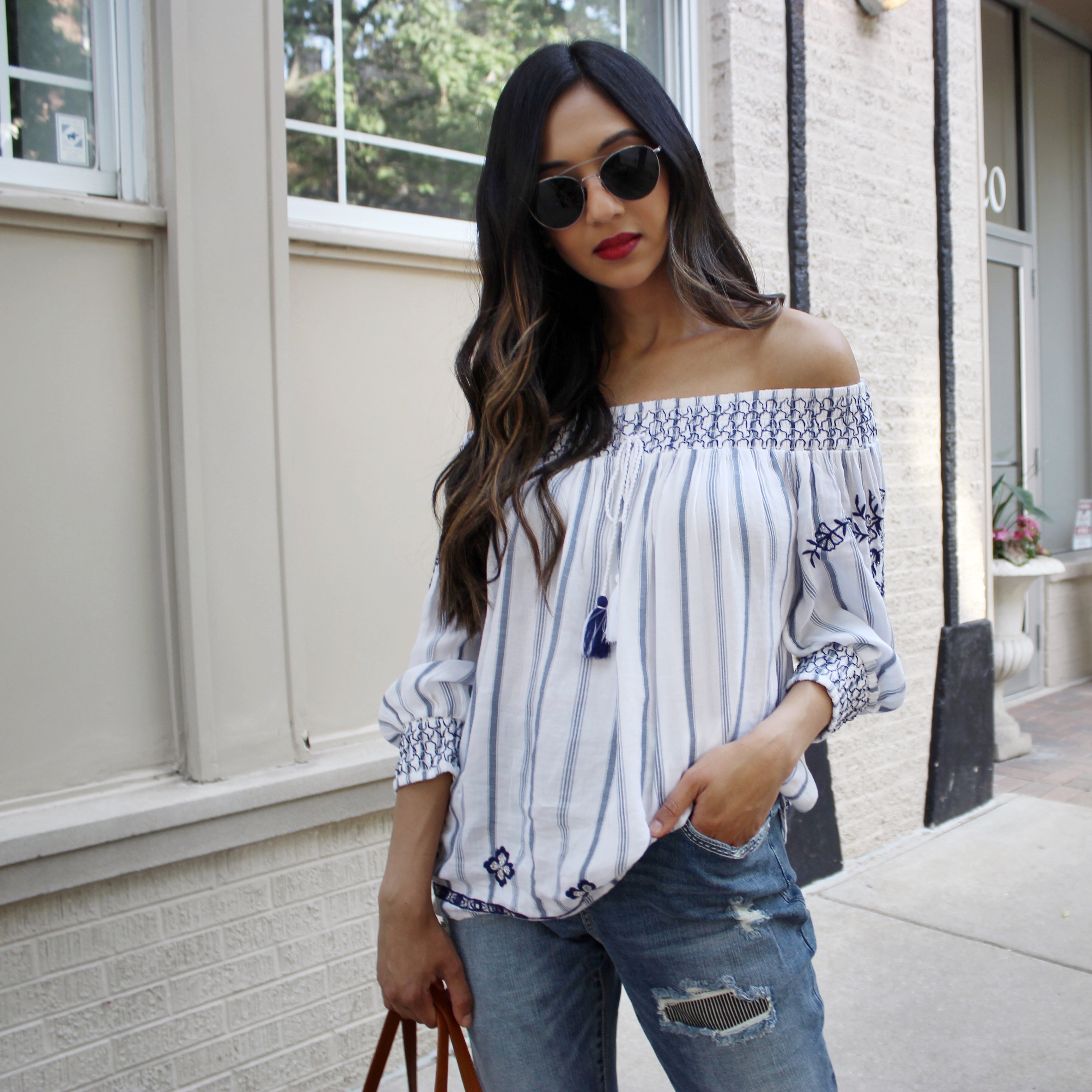 Since we are approaching the warmer months of the year, I thought it would be a great idea to round up a few printed and perfect for Summer options. Now the nice thing about INC International Concepts clothing is that it can be worn in so many different ways! Take this off –the-shoulder printed top for instance. I’ve paired it with a classic pair of boot leg cut patchwork jeans. Because of its versatility, it can be paired with a high waisted pair of shorts or even a cute skirt! Now I would stay with solid pieces for the bottoms only because mixing prints can go wrong easily, unless done right. This OTS top was incredibly comfortable and so easy to wear. I hate it when off-the-shoulder tops don’t actually stay off-the-shoulder, do you know what I mean? This one in particular keeps its form and is made of the softest material, making it perfect for hot days!