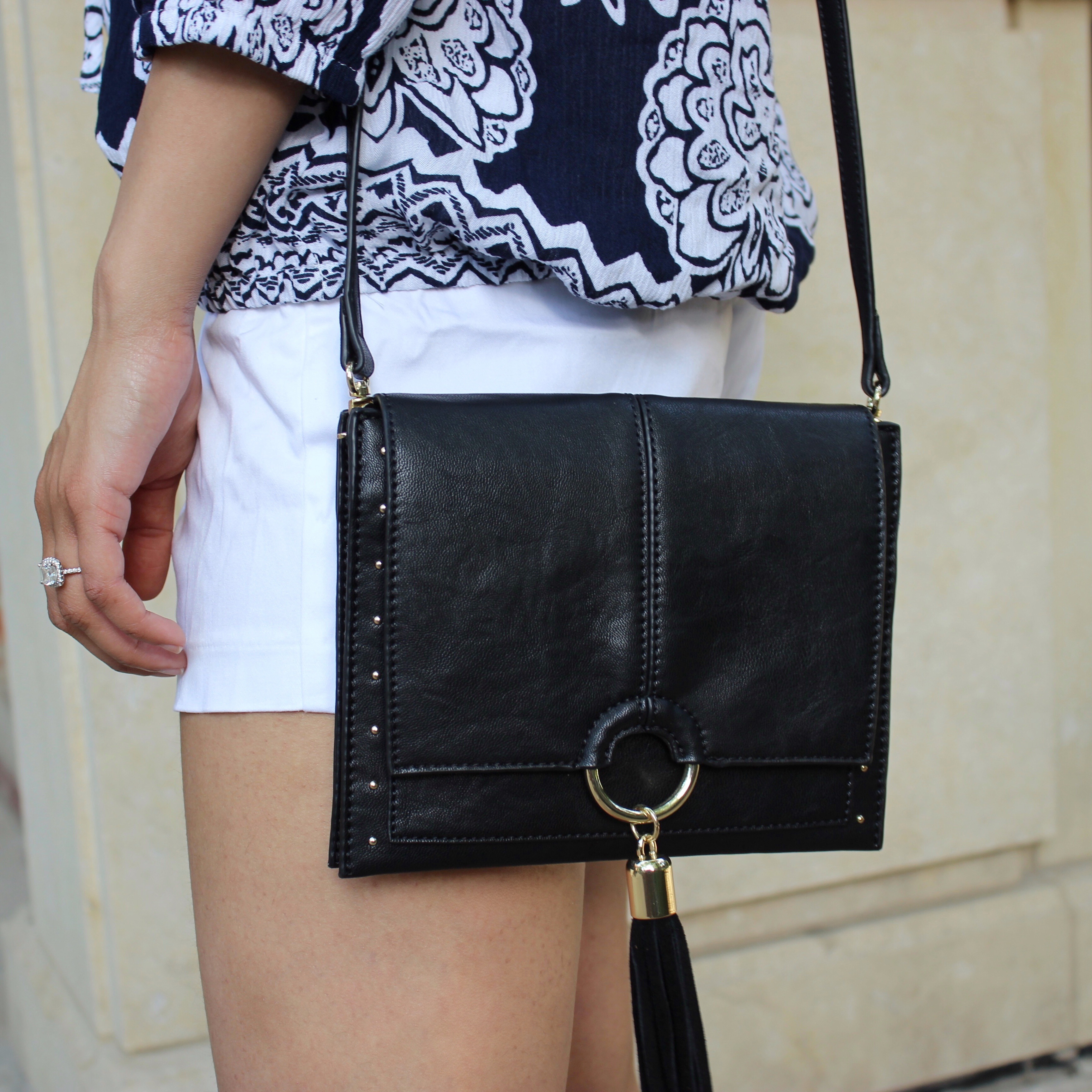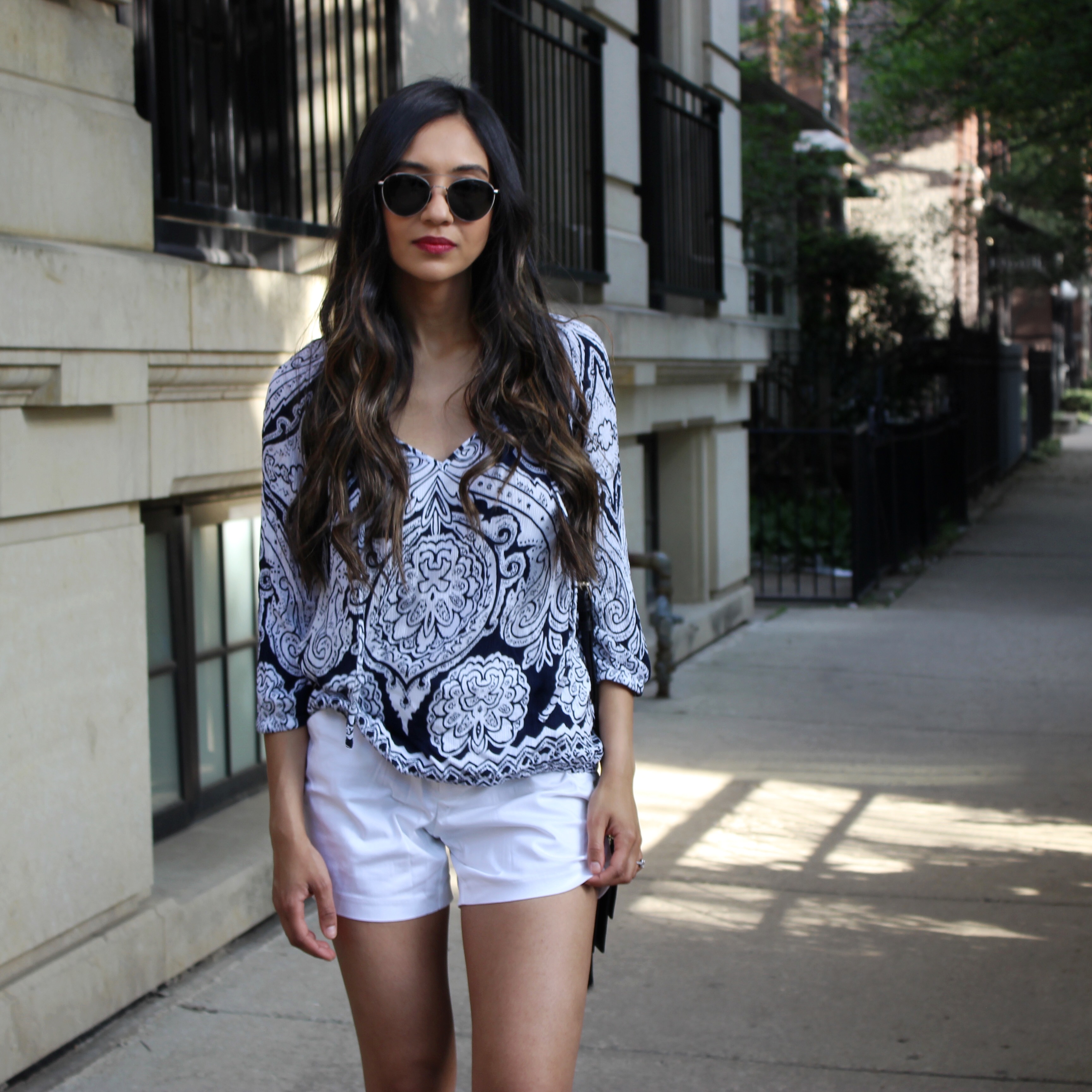 Secondly, I am sporting a cool printed top in blue and white. With Fourth of July around the corner, this look would be so festive and ideal for the long-weekend BBQ parties! Luckily, it’s also available in red and white, even more perfect for the occasion!