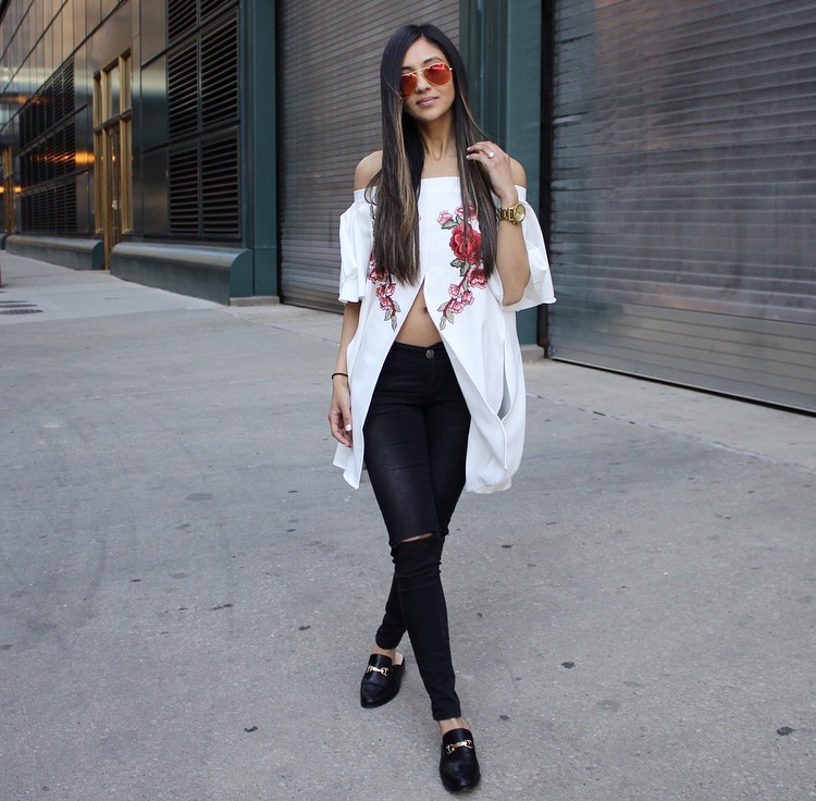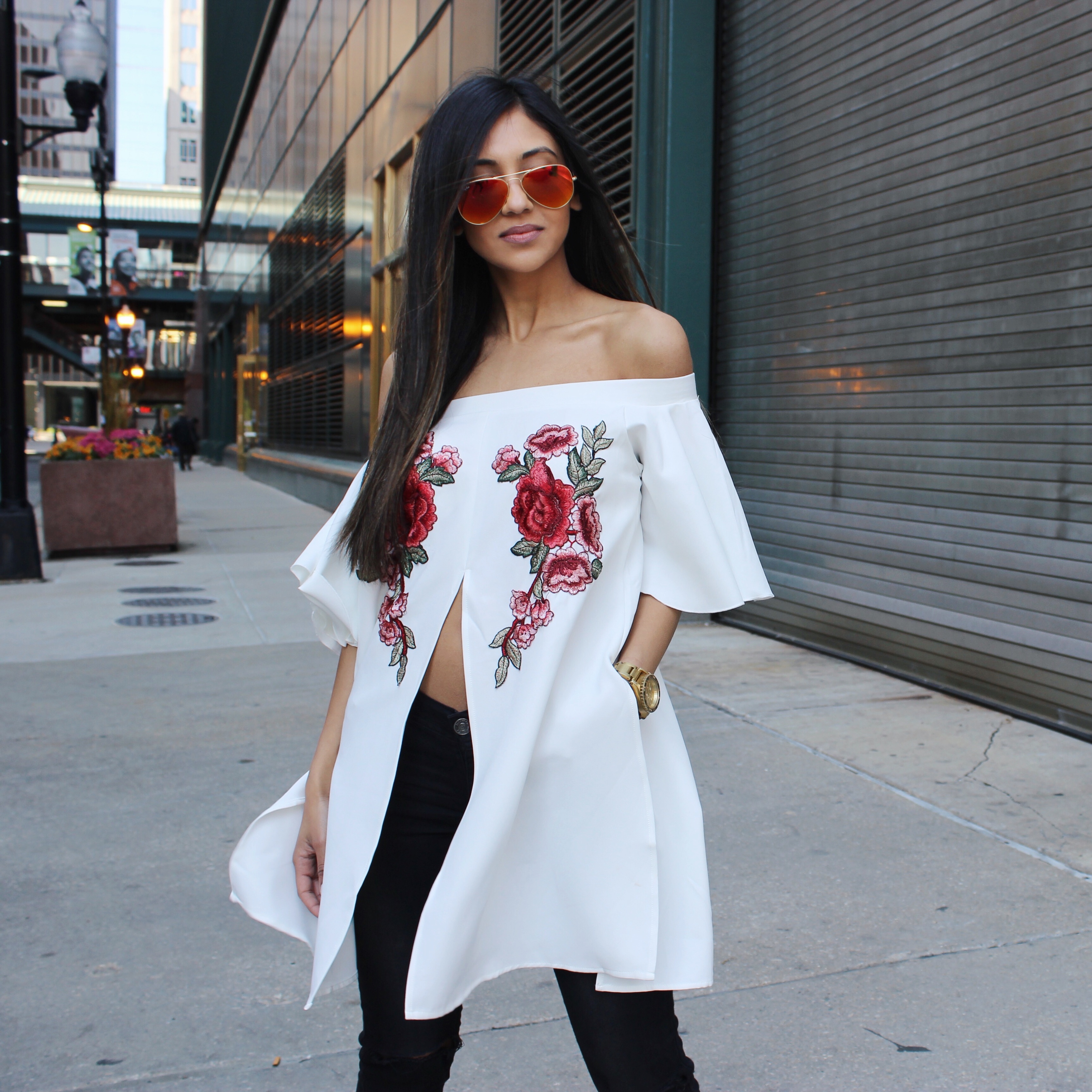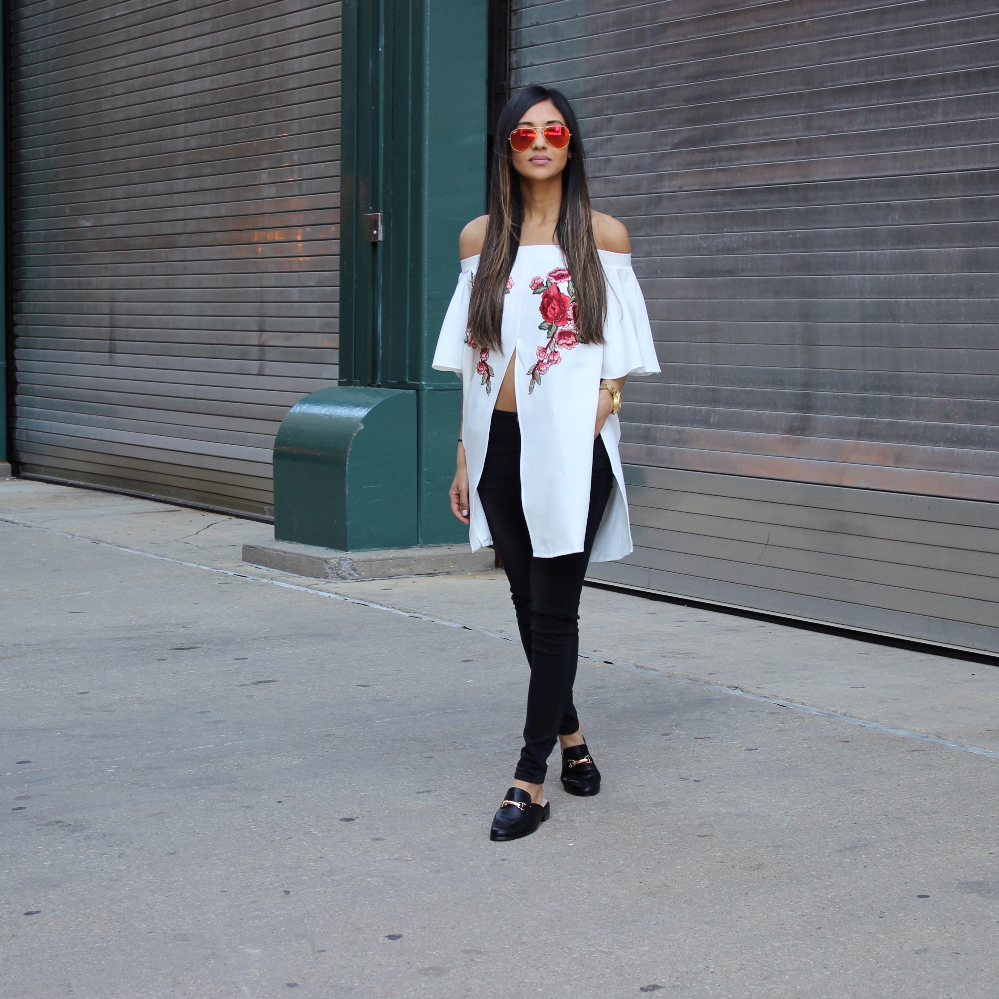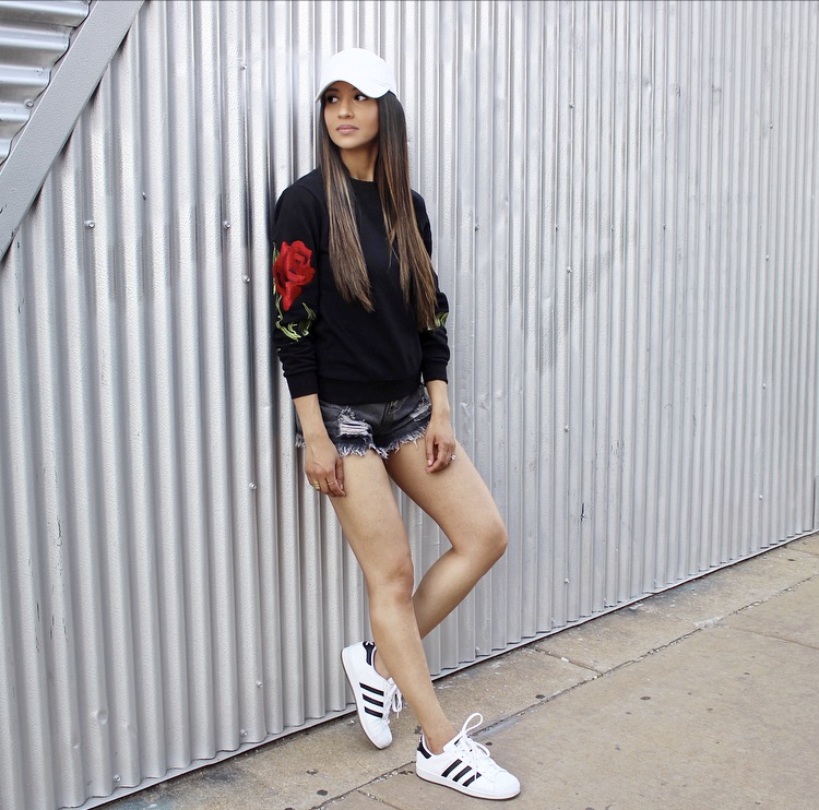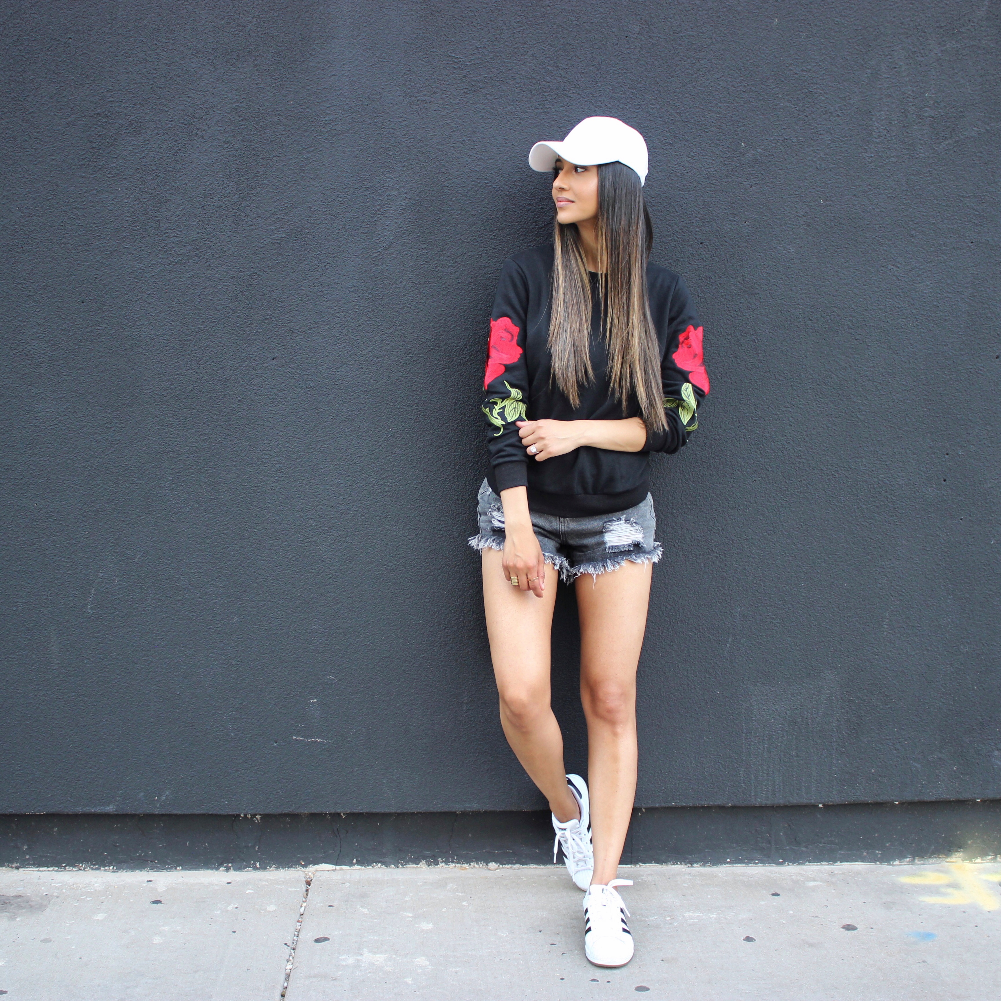 If you haven’t hopped on this band wagon yet, what are you waiting for? Embroidery is so in right now. It is the biggest trend this season, I swear. I’ve been seeing it on anything AND everything from tops, dresses, jackets, shorts, pants, shoes…I could go on forever. I am sporting not one, but two looks with floral embroidery. Could these be any more perfect for the warm weather? The first white off-the-shoulder top is from Shein and is so different with high slits on the sides and the front. On hot days it allows for an extra breeze! The sporty Romwe Floral Embroidery Sweatshirt is perfect for those casual chilly Summer days and nights. When you just want to throw something on and run out the door, but still look the part for the season, this piece is perfect.