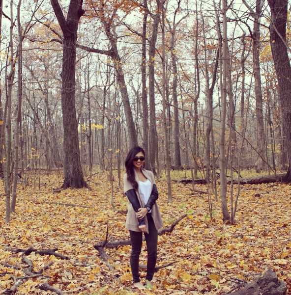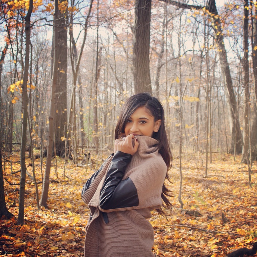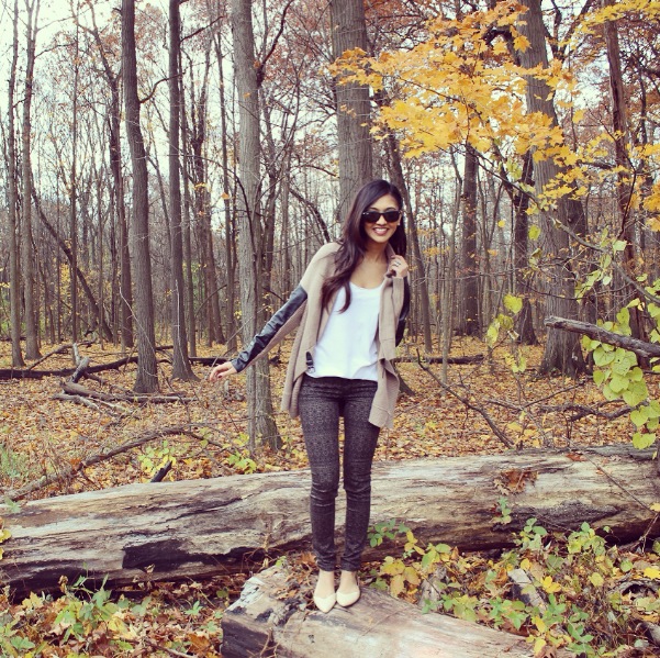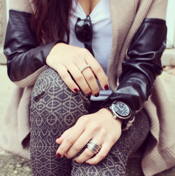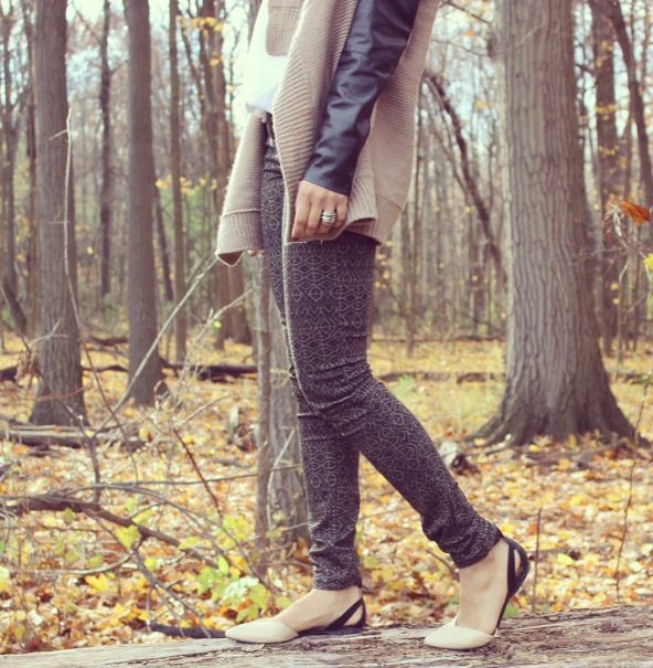 Leather can be risky. Many people feel it can be too overpowering but if you dress it up right, it can give you the perfect look. I was lucky when I came across this leather sleeved taupe cardigan because the combination of sweater + a lil’ bit of leather was exactly what I was looking for. Currently, a popular trend is printed pants and these slim-fit twill pants are one of my faves!