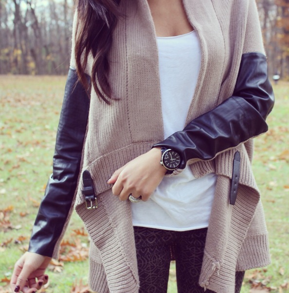 Cardigan: Pleather Sleeve Cardigan in Taupe