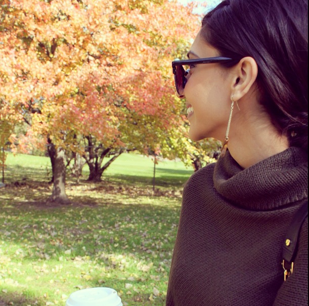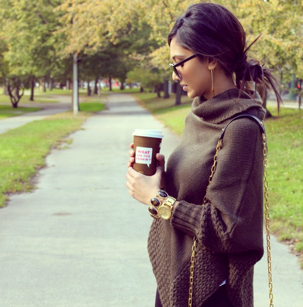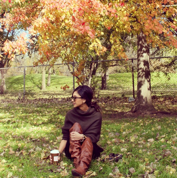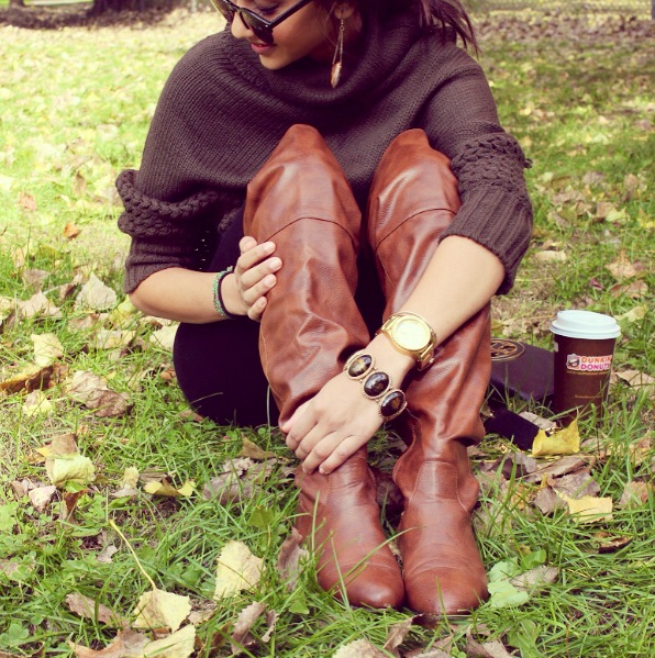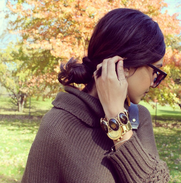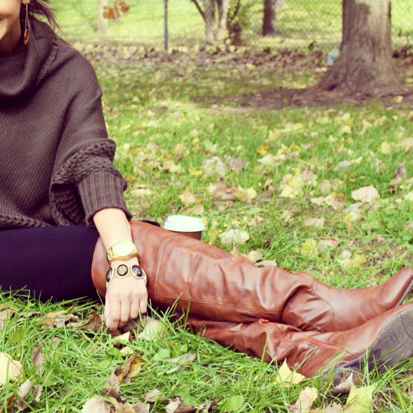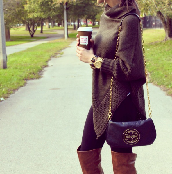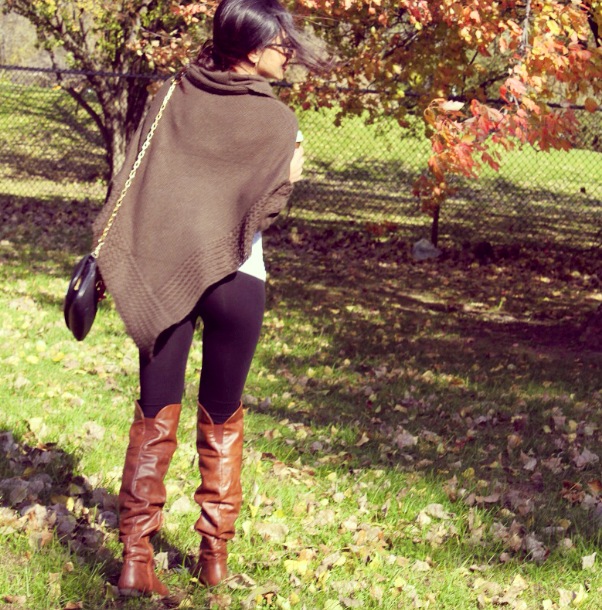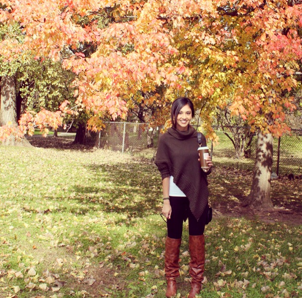 Ponchos are never out of style, especially when the autumn leaves fall. Warm and cozy knit sweaters and over-the-knee boots are two of my fall essentials. This olive green knit poncho is perfect for the rapidly approaching cold weather season in Chicago! Leggings and a knit sweater are a perfect combination for a chilly day in the windy city; everyone wants to be comfortable running errands! The chestnut boots can be worn over the knee or folded over, which gives me more of a reason to love them. Having your hair down gets tiring, so I threw it into a messy bun and was quickly out the door to start my day!