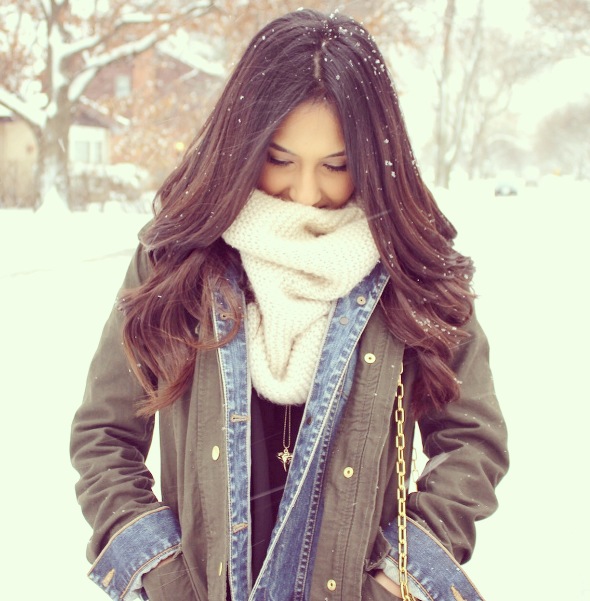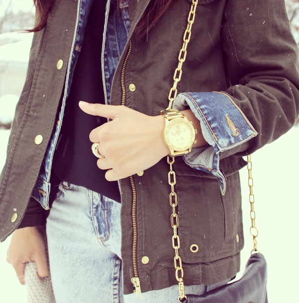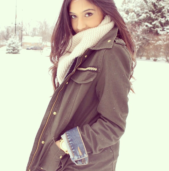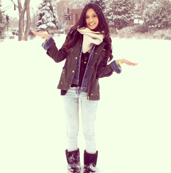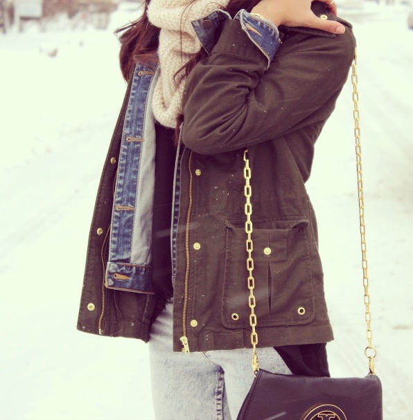 As hard as it is to believe, the best part about winter is actually the fashion trends (not the cold 😛 ). In this post, I am wearing a denim jacket layered with a cotton canvas jacket in khaki green. I’m also wearing a pair of slim fit acid wash jeans, a cozy knit infinity scarf, and keeping super toasty in nothing other than my black UGG Australia classic tall boots!