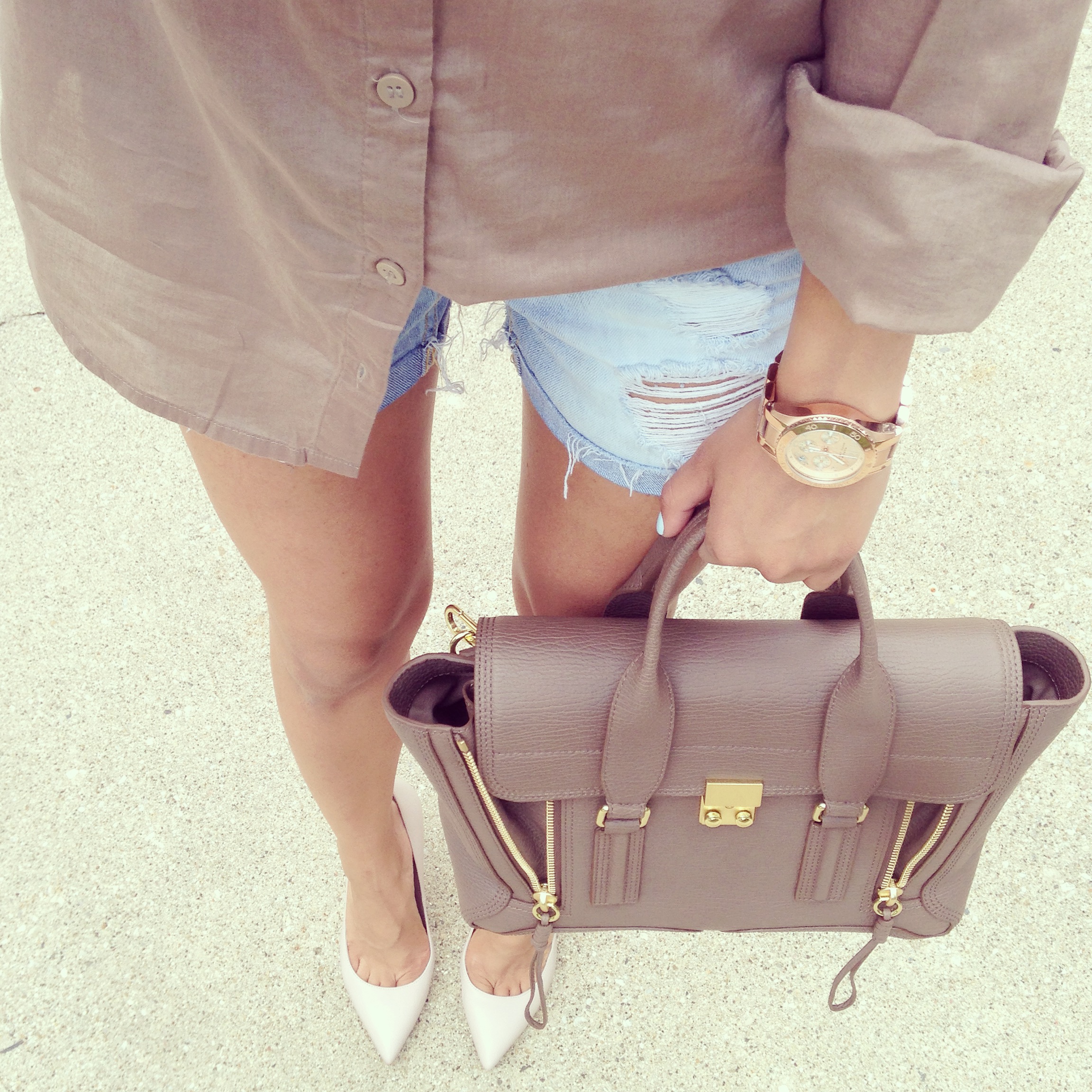 I’m so into my new neutral buys. My new 3.1 Phillip Lim Pashli handbag is the perfect shade of earthy brown. The gold zipper detailing is just right and the bag is quite spacious. It can also be worn as a cross body purse which makes it perfect for traveling! You can expect several appearances from my Pashli over the rest of the summer! My new buys also include the most comfortable pair of nude pumps from TopShop and let’s not forget my new rose gold accessory, a Marc Jacobs watch. If you like what you see, find direct links to the items below!