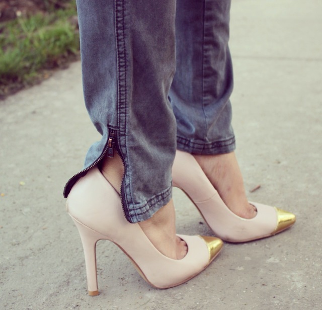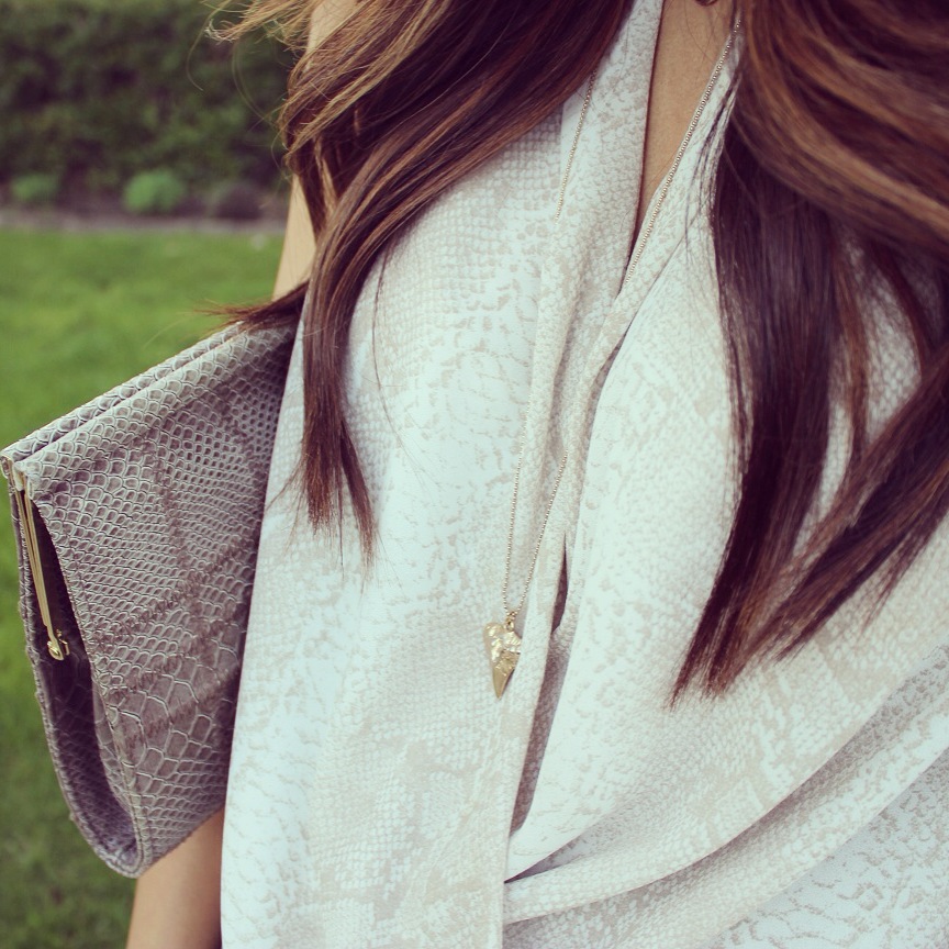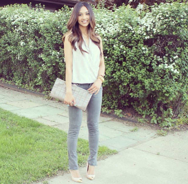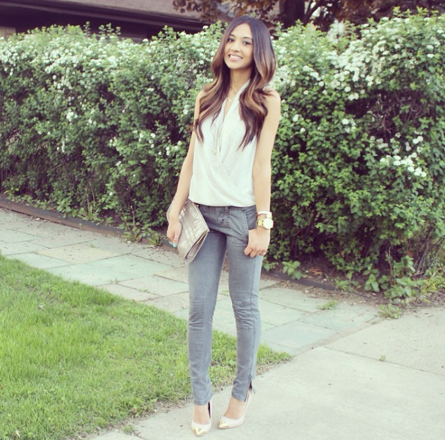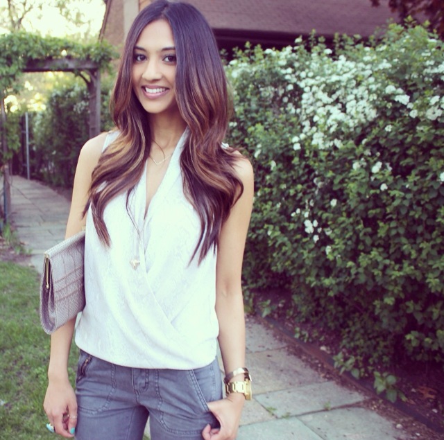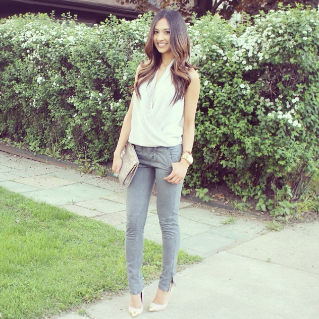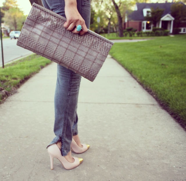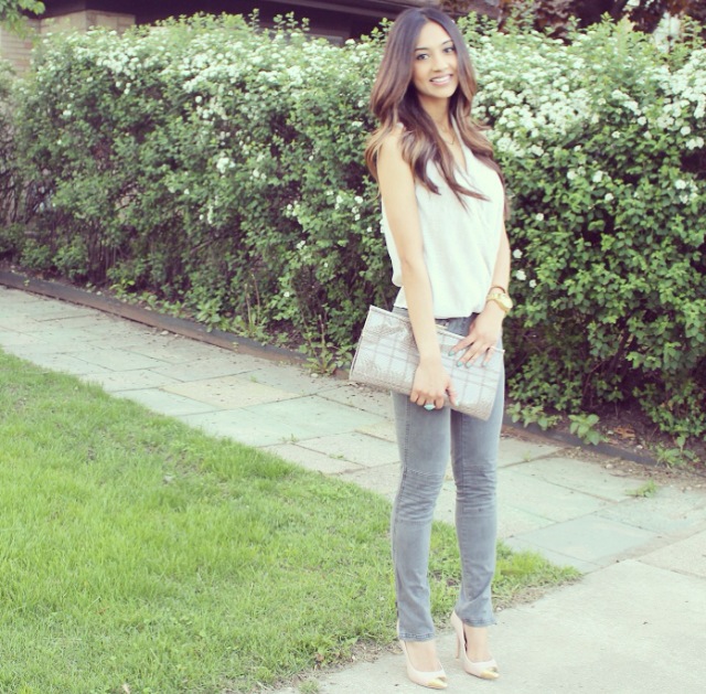 This outfit is from a date night last week when my boyfriend and I went to go watch Aziz Ansari at the Chicago theater. He is of my favorite comedians. The top I’m wearing is about a year old from H&M. It’s a surplice style top, which means it’s a wrap front top. This style is most definitely one of my favorites! It’s fit is very comfortable; loose yet sexy. If you’re body conscious, you will absolutely love the fit. This style top is made for all body types. I paired it with a simple charcoal pair of moto pants from Target. As you all know I love the ankle zippers, so I couldn’t resist when I saw them. Some nude heels and to keep it in the neutral family I grabbed a printed clutch and was ready for date night!