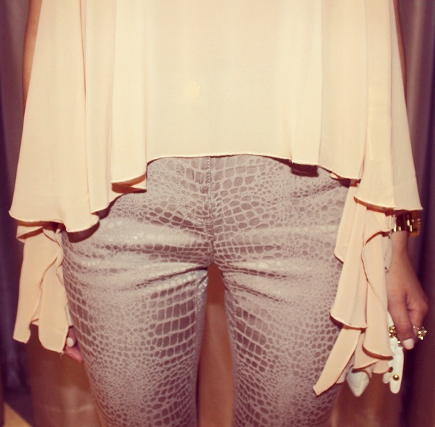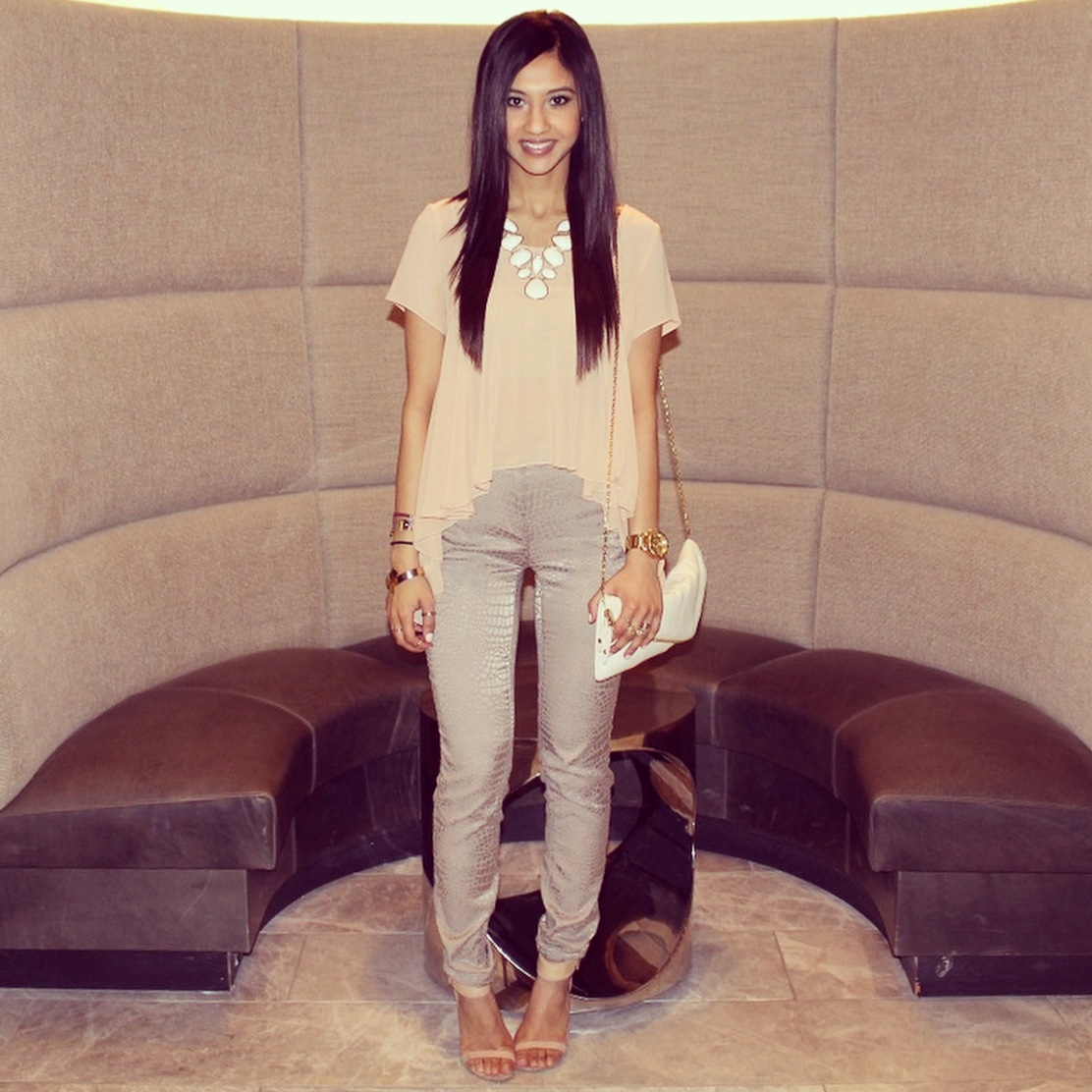 Last Thursday to the Akira Just Neon Fashion Show, I wore all neutral tones. This look consists of an assymetrical tapered babydoll chiffon tee, animal print pants, earthy-toned heels, clutch, and necklace. I love the cut of this top from Akira Chicago, its edgy and chic at the same time. The animal print on these H&M pants are to die for. Matching the necklace with purse was unintentional, but worked out well anyway.