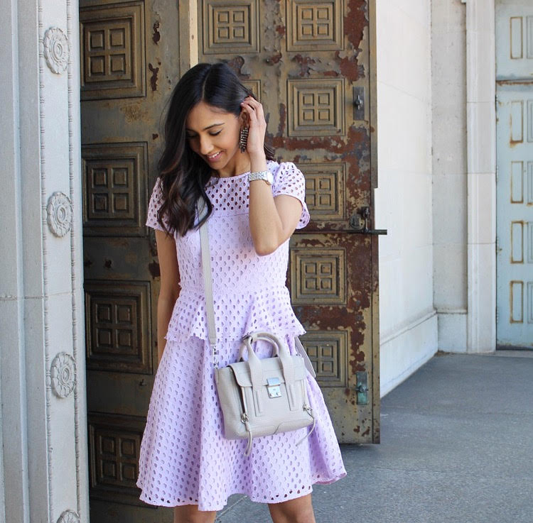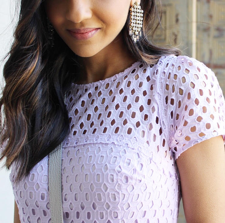 Today’s post is about the perfect Spring dress from Banana Republic! The fresh lavender color has Spring written all over it and the peplum style is great for all body types. The Geo- Lace Peplum dress is also available in black and white and in a variety of sizes (petite, regular & tall), which is a plus because come on, who doesn’t love options. The geo-lace fabric is a new modern take on mesh. It’s conservative length gives it opportunity for several occasions while making the dress fun and flirty. I kept the focus on the dress by not over-accessorizing and simply pairing it with some Missguided strappy heels and a Phillip Lim crossbody bag. These gorgeous Banana Republic earrings happen to be the cherry on top for this Sunday look 😉 . They are the Mixed-up Pearl Chandelier Earrings, which consist of the perfect pearl/bling combo! They look heavy, however are light weight and easy on the ears. The last thing we want are earrings to weigh us down, am I right?!