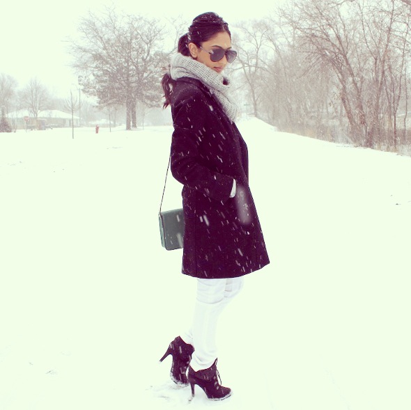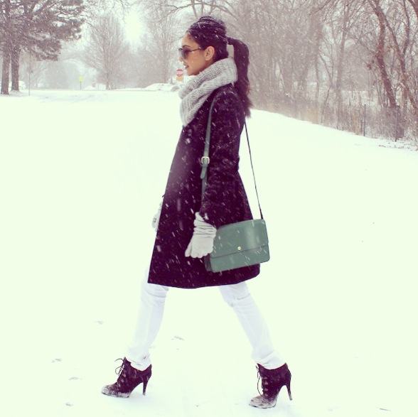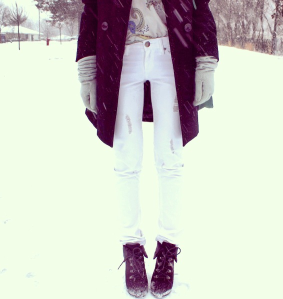 I wanted to put together a white winter look, despite the unofficial fashion rule that frowns upon wearing white after Labor Day. In a snowy and windy city like Chicago, you have to make your own exceptions. Pairing up some distressed white denim with a sturdy pair of ankle boots, I was fit for walking in the snow. To top off the look, like a cherry on a sundae, I put on this classic black peacoat that can be worn for any occasion!