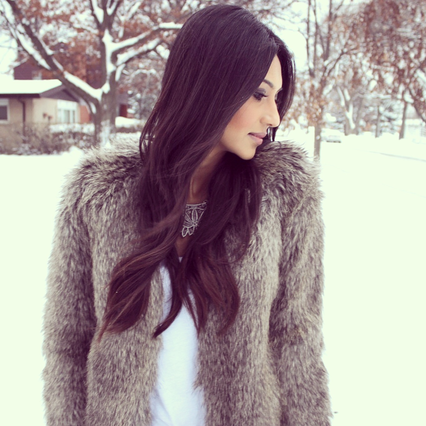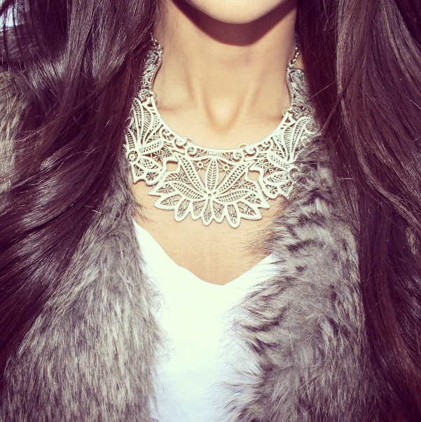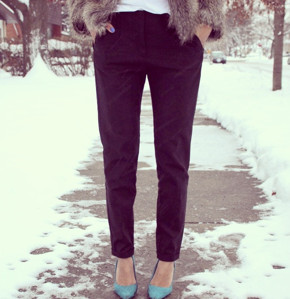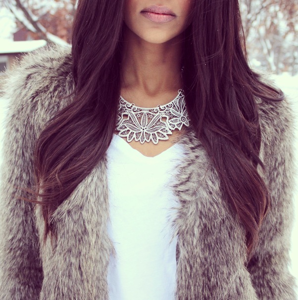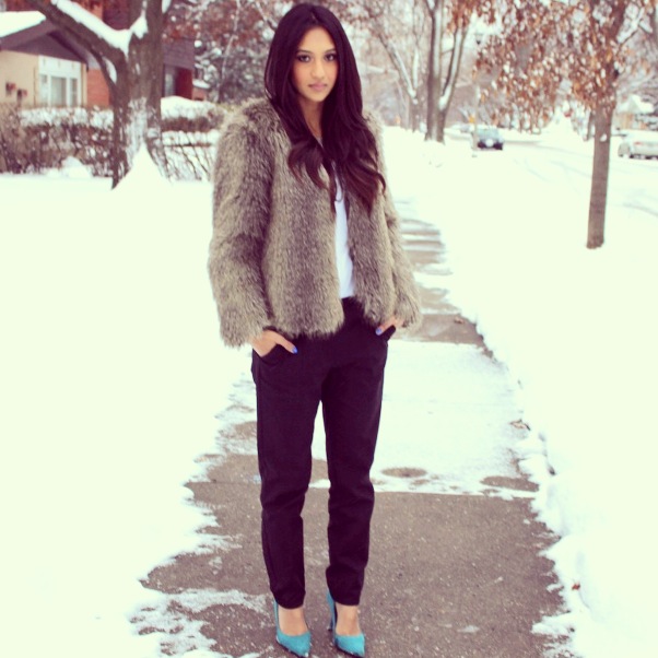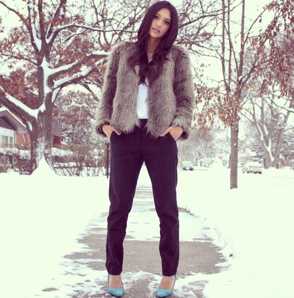 Nothing makes me feel more like an ice princess than this faux fur jacket from H&M (not to mention, its super warm!) With the jacket being the focus of this look, I found it best to keep the rest of my outfit simple. I toned it down by wearing some black trousers and a plain white tee. I completed this look with a statement necklace and a pair of green suede pointed-toe pumps.