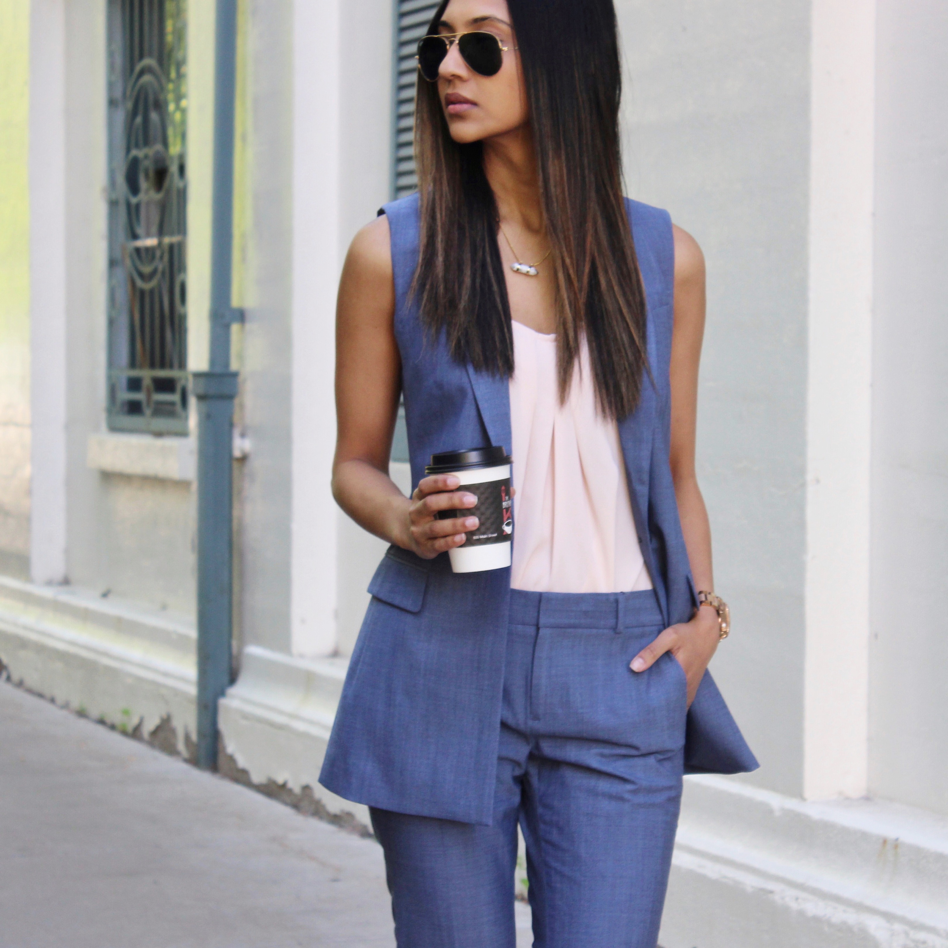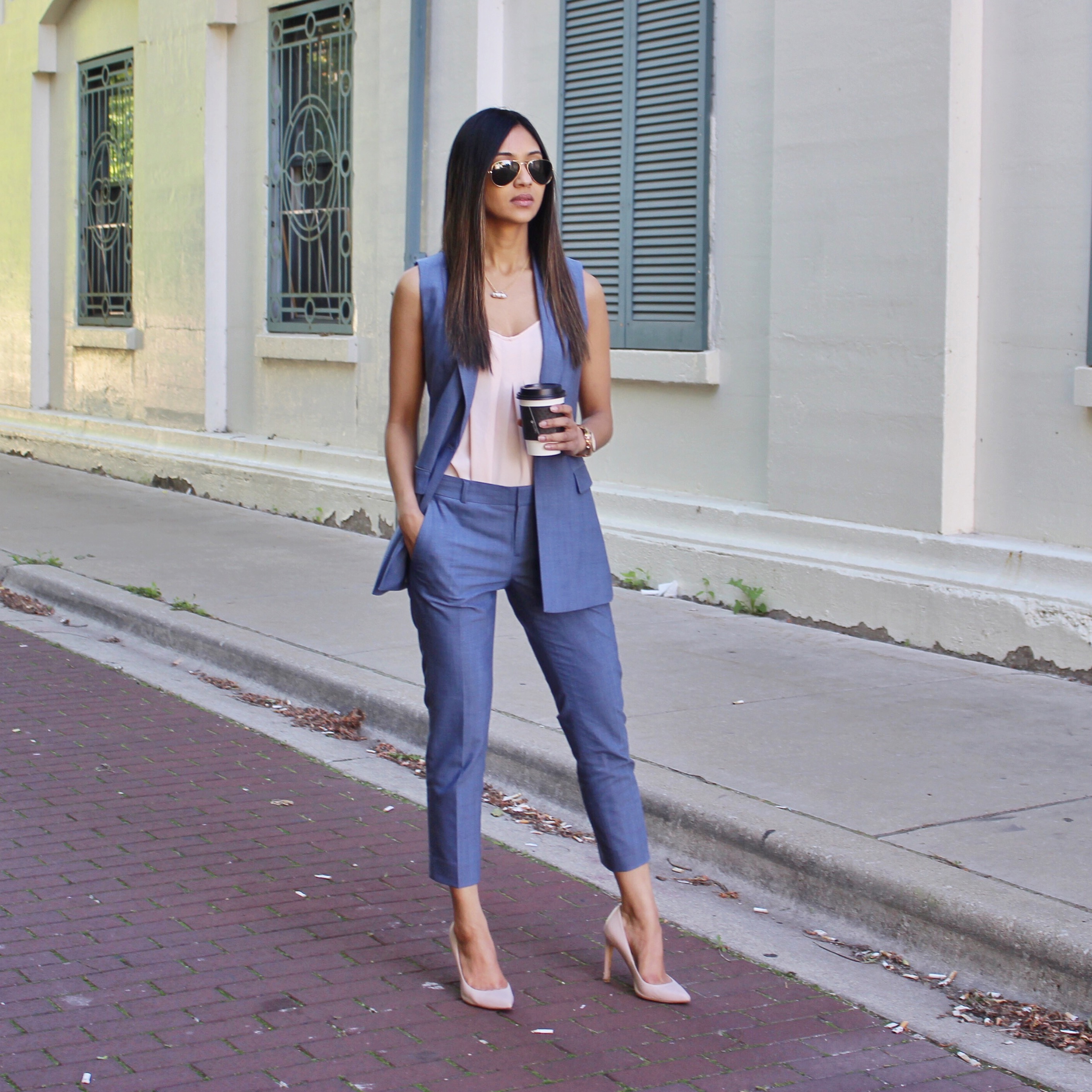 Nothing screams “I mean business” quite as fashionably as a co-ord set. Co-ord sets come in different styles ranging from pants to shorts, and even skirts. I am wearing the Avery- fit Chambray Lightweight Wool Pants and the Chambray Lightweight Wool Vest from Banana Republic. The color of this set is so great and refreshing, it perfectly embraces the Summer vibe. The sleeveless vest is accommodating to the warm weather, however, it is also available as a blazer. Their selection of sets are great for work and play. Since they are great for any occasion and so versatile, they work great not only as a set, but also as separates. You can definitely rock the top or bottom with your closet favorite to make a brand new look.